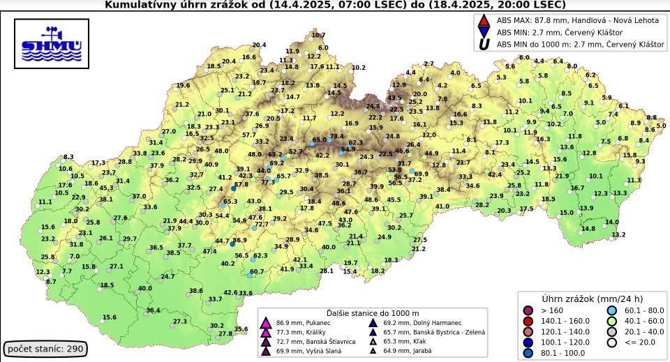Počas tohto týždňa napadlo na väčšine Slovenska zatiaľ 15 až 50 milimetrov (mm) zrážok. Ojedinele to bolo aj výrazne viac, napríklad v Pukanci (okres Levice) spadlo od pondelka (14. 4.) do piatkového (18. 4.) večera 86,9 mm a v Novej Lehote pri Handlovej 87,8 mm. Informuje o tom Slovenský hydrometeorologický ústav (SHMÚ) na sociálnej sieti.