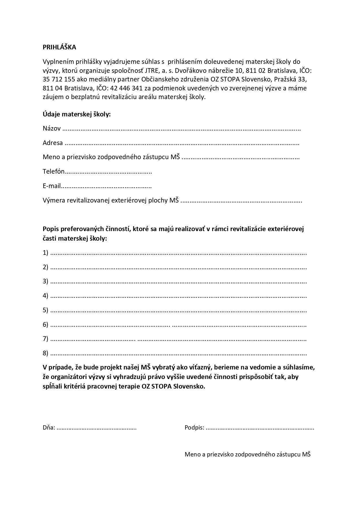 - Vyplnenú prihlášku pošlite do 25. júna 2025 na e-mailovú adresu vyzvastopa@jtre.sk.