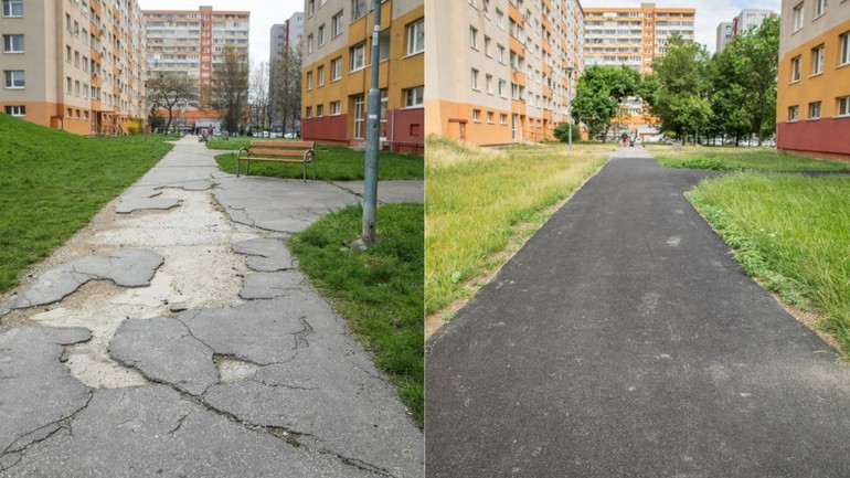 Chodník v Petržalke pred opravou a po opraveBratislavská mestská časť Petržalka pokračuje v celoplošnej oprave chodníkov. Opravou vo vlastnej réžii dokáže najľudnatejšie sídlisko ušetriť polovicu nákladov. Okrem chodníkov sa venuje aj priľahlým športoviskám, detským ihriskám či areálom základných i materských škôl. Informovala nás o tom hovorkyňa Petržalky Mária Halašková.