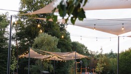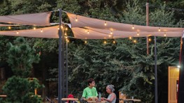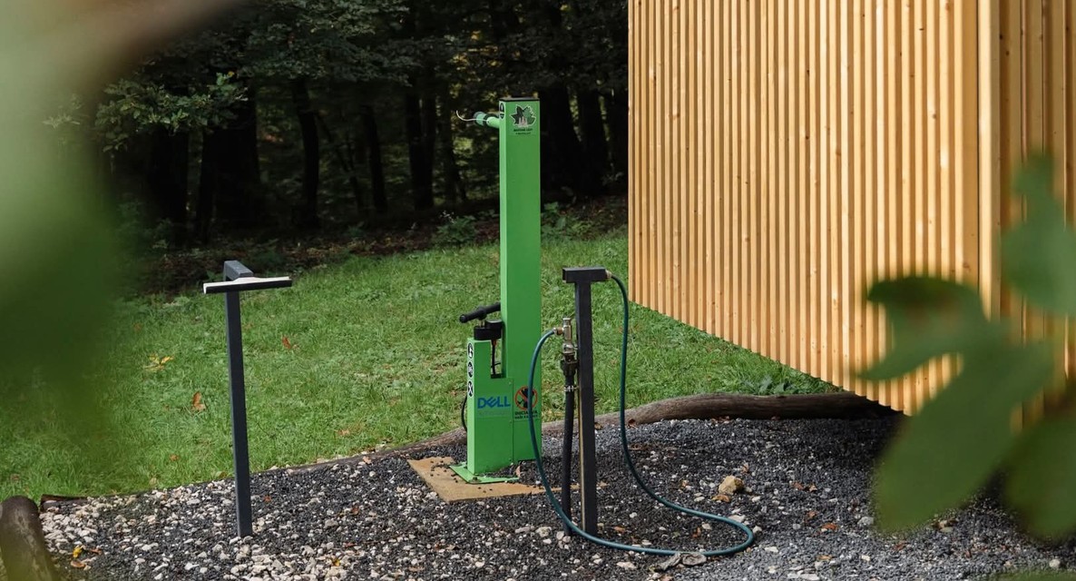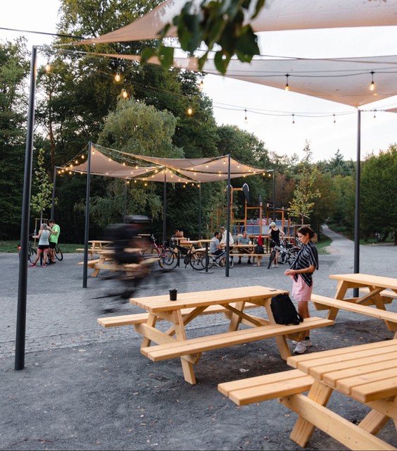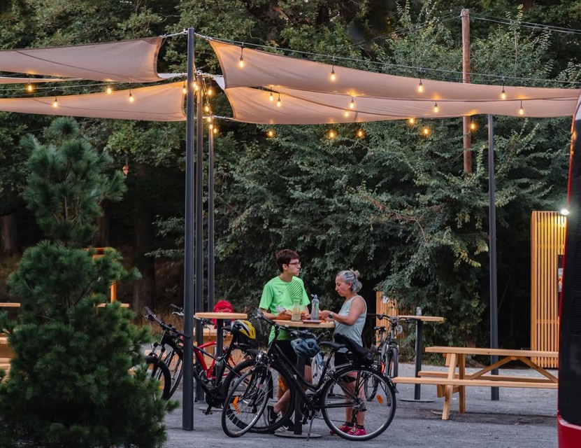 Pribudol servisný cyklostojan a miesto na umytie bicykla, nové sedenie, stolíky, koše a stojany na bicykle - vlastná výroba z lokálneho dreva, tieniace plachty a večerné svetielka pre príjemnú atmosféru.