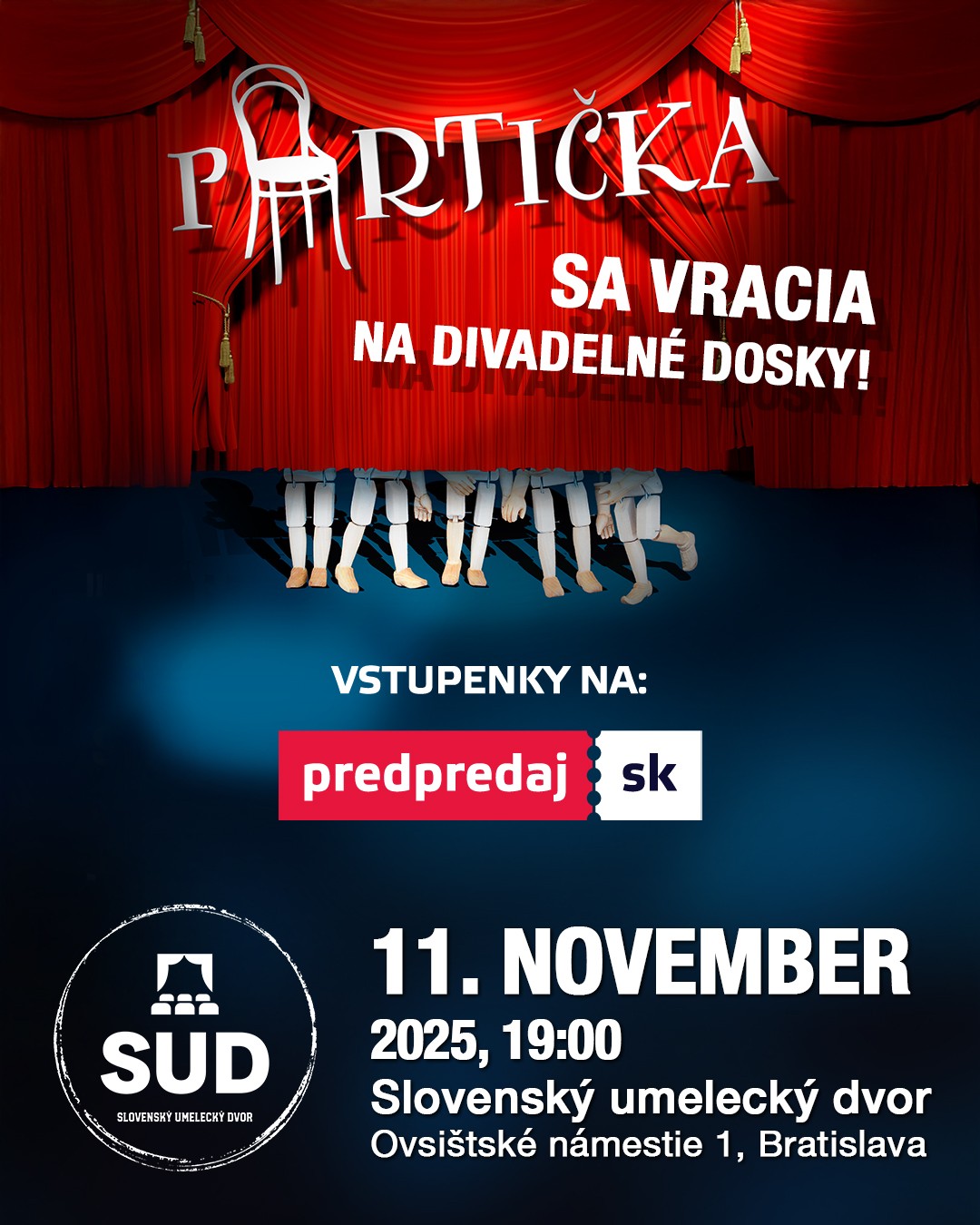 Kultová improvizačná šou Partička s Danom Danglom, Lukášom Latinákom, Jurajom Kemkom, Michalom Kubovčíkom, Romanom Pomajbom a ďalšími, sa vrátila práve na javisko SUD-u – a okamžite naplnila sálu. Hostia dokonca po predstavení zostávajú na drink v divadelnej kaviarni, kde atmosféra pripomína staré dobré časy.