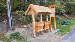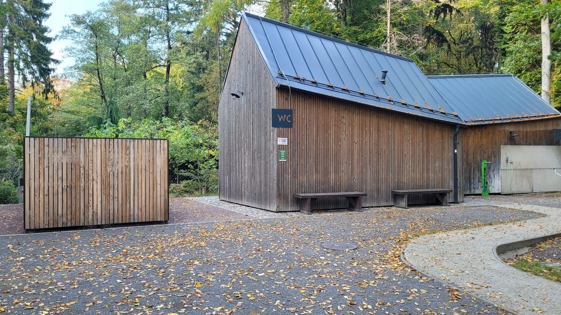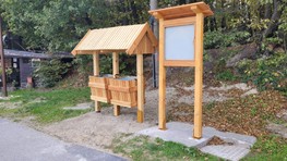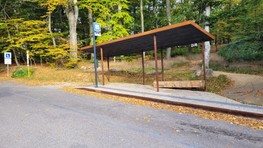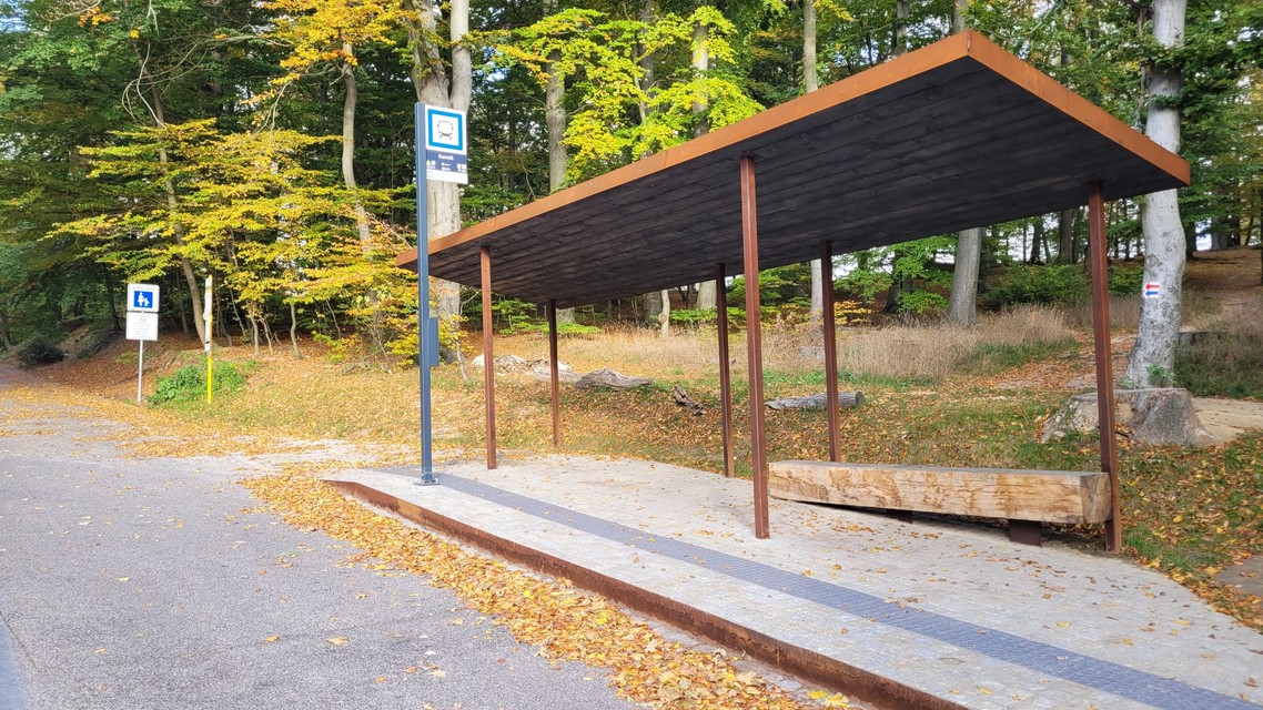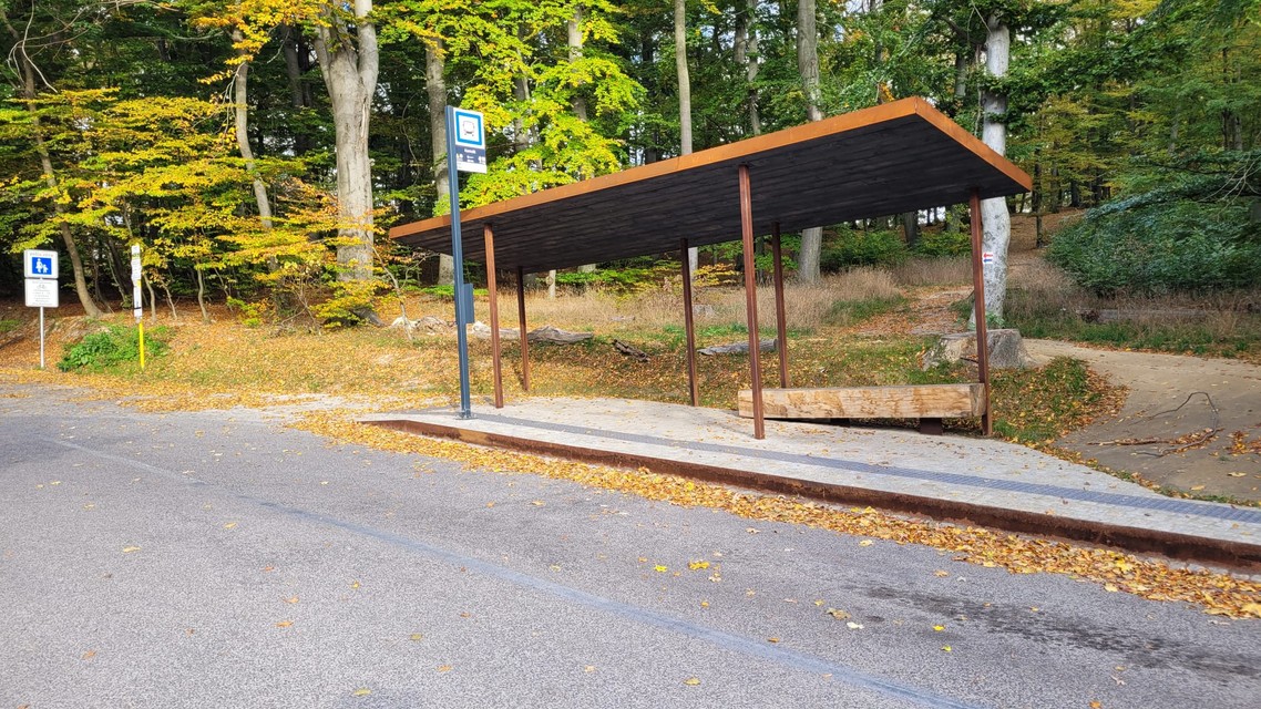 Zmenou prešiel aj vstup do tohto areálu, kde pribudla bezbariérová zastávka autobusu s atypickým prístreškom. Stojí pri vstupe do lesoparku, v blízkosti otočiska a parkoviska pre návštevníkov. Podľa mestskej organizácie je koncipovaná ako vstupný portál do lesoparku, teda otvorená do všetkých smerov a umiestnená na križovatke ciest a chodníkov.