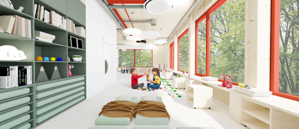 Pri návrhu interiéru sme sa rozhodli ísť cestou maximálneho využitia dreva – nielen z estetických a ekologických dôvodov, ale hlavne preto, že ide o materiál, ktorý má pozitívny vplyv na psychiku a správanie detí. Drevo prirodzene reguluje vlhkosť vzduchu, má príjemnú povrchovú teplotu a vytvára harmonické a upokojujúce prostredie. V interiéri sa objavuje v podobe pohľadových CLT panelov, nábytku na mieru, akustických prvkov aj masívneho schodiska.