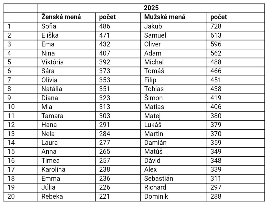 Prvých 20 najobľúbenejších mužských a ženských mien pre novorodencov v roku 2025, údaje sú aktualizované k 10. decembru 2025: