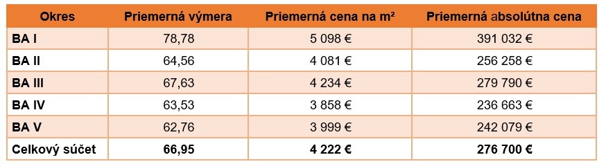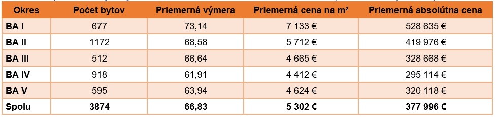 Priemerná plocha ponúkaných bytov zostala nezmenená a predstavuje 66,83 m². Polovica celej ponuky bytov je sústredená v okresoch Bratislava II (30 %) a Bratislava IV (24 %).