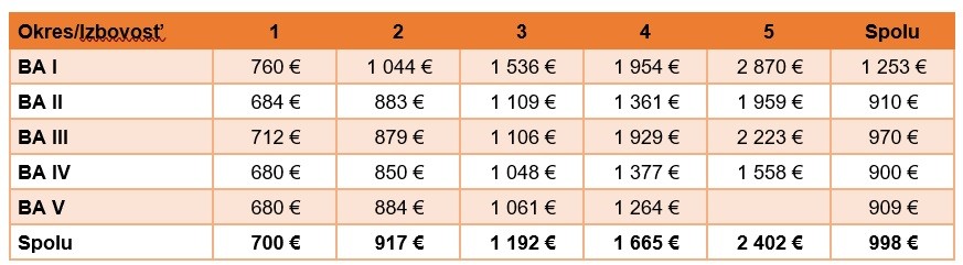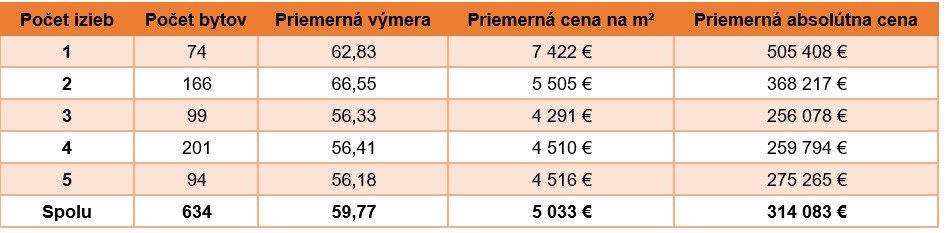 S korekciou jednotkovej ceny, pri nezmenenej priemernej ploche, došlo k zníženiu priemernej absolútnej ceny o necelých 6 000 €, no aj tak je medziročne vyššia o 9 % a dosahuje 377 989,80 € s DPH.