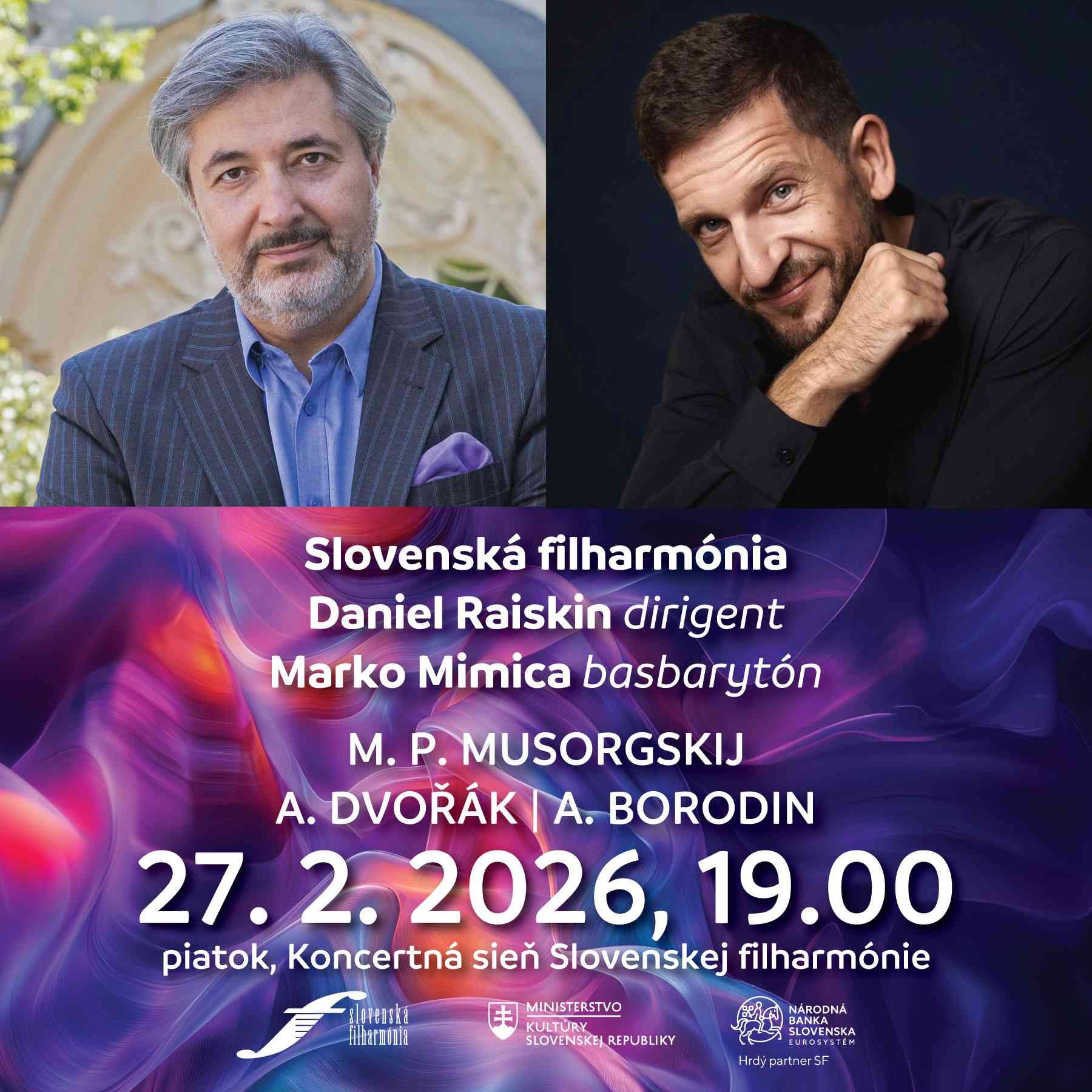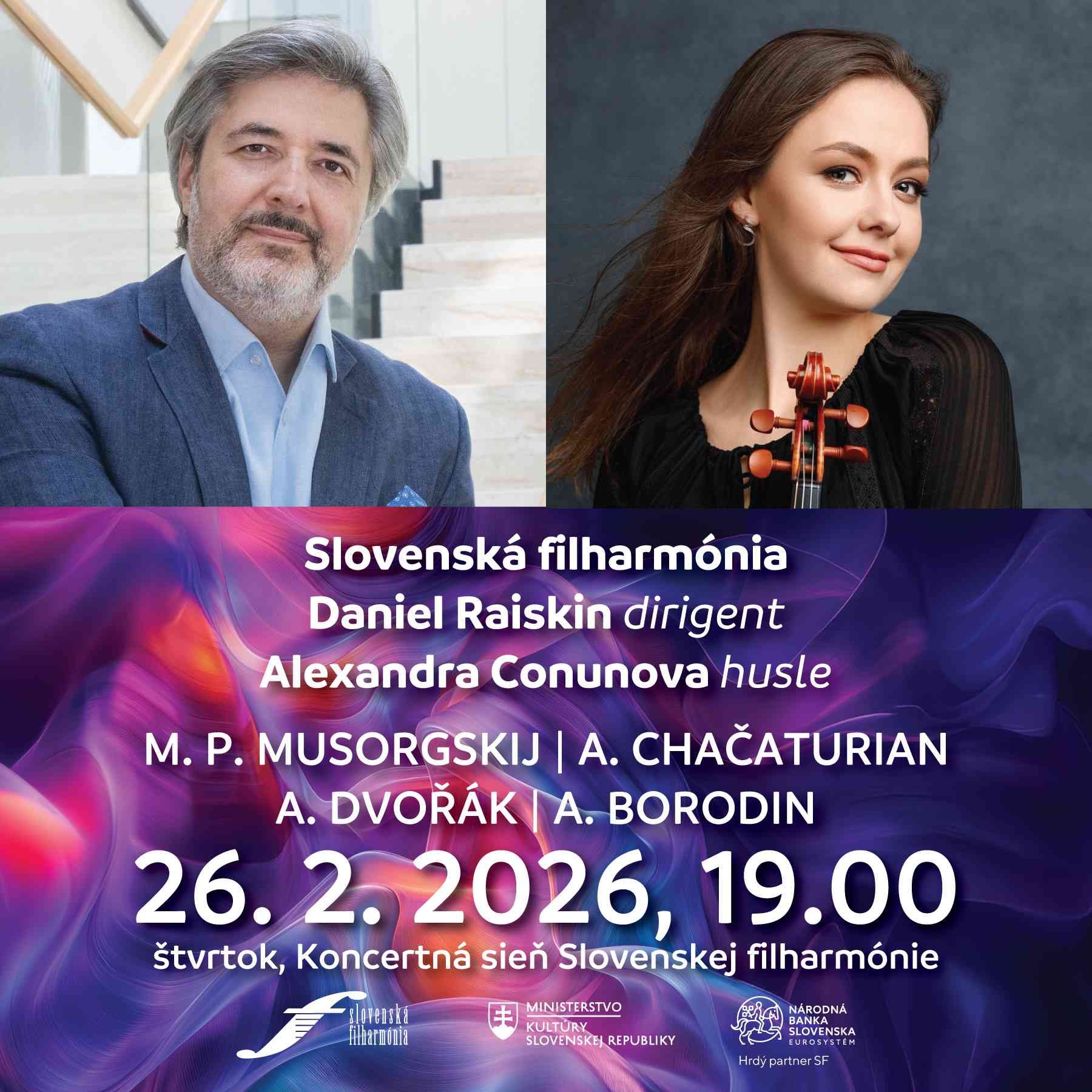 Záverečná februárová dvojica je na programe vo štvrtok a piatok 26. a 27. februára 2026. Bude patriť orchestru Slovenská filharmónia a stálemu hosťujúcemu dirigentovi Danielovi Raiskinovi. V jeho naštudovaní zaznejú symfonické diela Modesta Petroviča Musorgského, Arama Chačaturiana, Antonína Dvořáka a Alexandra Borodina. Sólistami dvoch večerov budú huslistka Alexandra Conunova (26. februára 2026), a basbarytonista Marco Mimica (27. februára 2026). Program symfonickej dvojice koncertov zaznie v Bratislave a následne na umeleckom zájazde v španielskych mestách – Barcelona, Zaragoza, Madrid, Valencia a Alicante, kam spoločne umelci odcestujú v nedeľu 1. marca 2026. Na koncertoch v Bratislave sa k orchestru pripojí Slovenský filharmonický zbor.