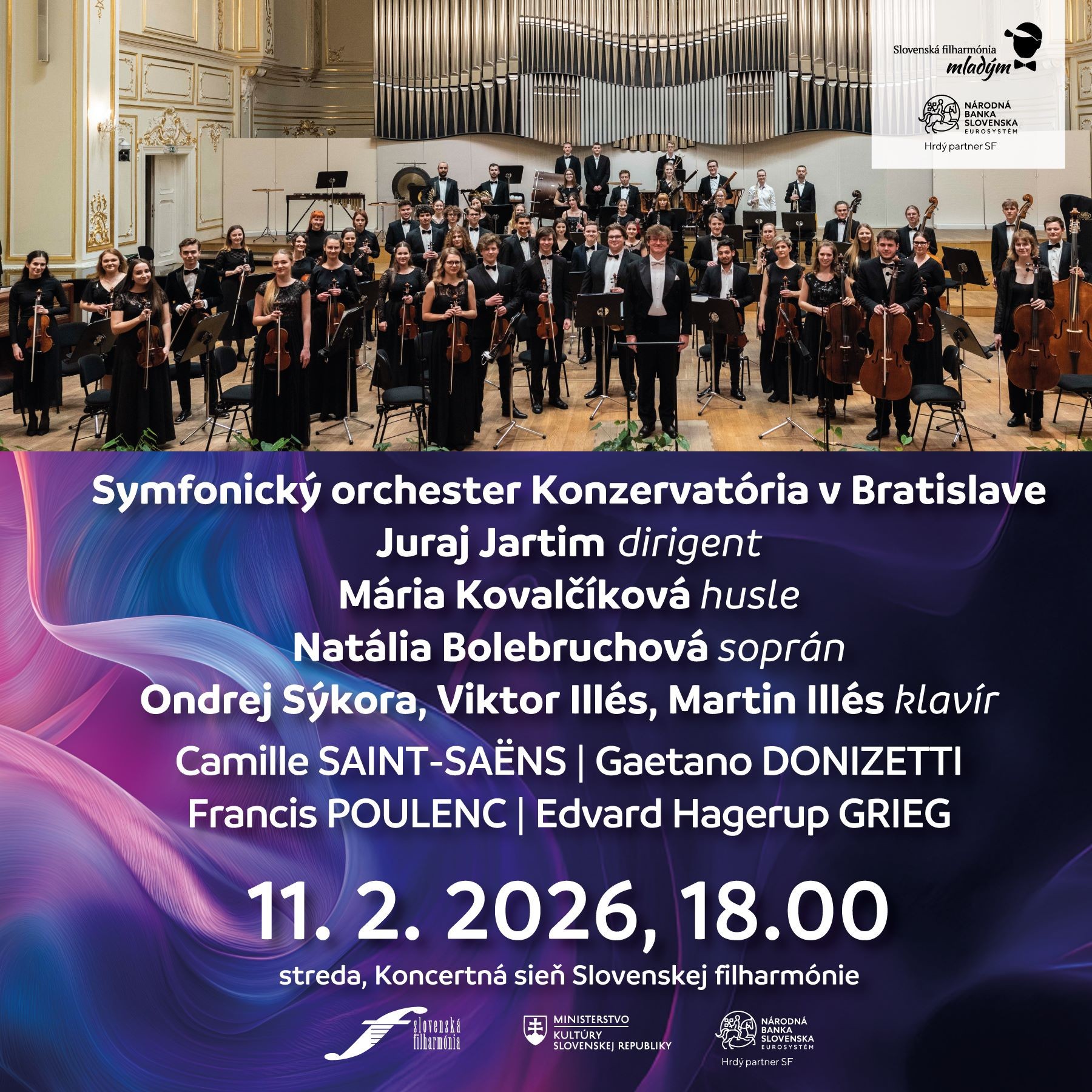 Úvodný koncert cyklu Junior sa uskutoční v stredu 11. februára 2026. Koncertná sieň bude patriť mladým umelcom, členom Symfonického orchestra Konzervatória v Bratislave, ktorí sa predstavia pod taktovkou pedagóga Juraja Jartima. Sólistami večera budú piati študenti Konzervatória v Bratislave, laureáti domácich a medzinárodných interpretačných súťaží - huslistka Mária Kovalčíková, sopranistka Natália Bolebruchová, a traja klaviristi – Ondrej Sýkora a bratia Viktor a Martin Illésovci, v interpretácii ktorých zaznie Koncert pre dva klavíry a orchester d mol Francisa Poulenca. Koncert sa začne o 18.00.