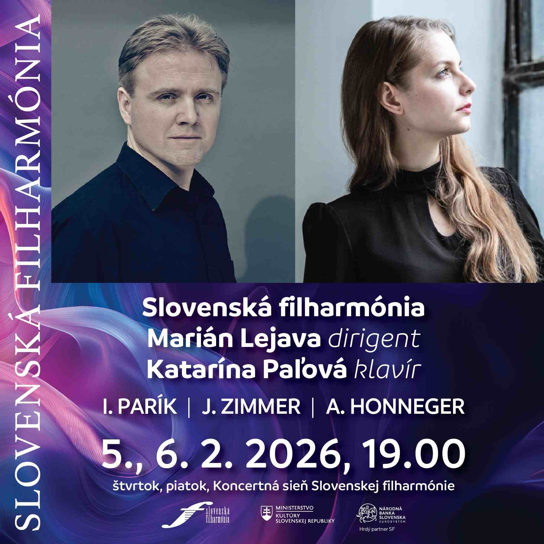 Úvodná februárová dvojica vo štvrtok a piatok 5. a 6. februára 2026 o 19.00 sa bude niesť v znamení nových diel a mladých interpretov. Za dirigentským pultom privítame Mariána Lejavu, sólistkou večerov bude slovenská klaviristka Katarína Paľová, ktorá sa zameriava najmä na hudbu 20. a 21. storočia s akcentom na diela menej hrávaných či zabudnutých autorov. Program spojí tri osobnosti 20. storočia – dvoch slovenských skladateľov Ivana Paríka, Jána Zimmera a Arthura Honeggera. Paríkovo dielo Musica pastoralis vzniklo v roku 1984 a od svojich počiatkov je úzko späté so Slovenskou filharmóniou. Premiérovo zaznelo na umeleckom zájazde v Nemecku, 27. januára 1985 v Lipsku. Slovenskú filharmóniu dirigoval Bystrík Režucha, ktorému je venované. „Túto partitúru pripisujem Bystríkovi Režuchovi a jeho (blížiacim sa) päťdesiatinám s vďakou za celoživotné umelecké a ľudské priateľstvo,“ napísal skladateľ. V posledných rokoch sa znovu dostáva do pozornosti verejnosti kompozičná tvorba Jána Zimmera (1926 – 1993), významného slovenského skladateľa, klaviristu, organistu a hudobného pedagóga. Napísal vyše 120 opusov, vrátane 3 opier, 13 symfónií, 7 klavírnych koncertov a množstva komorných a sólových diel. Z jeho hudobného odkazu si vypočujeme v koncertnej premiére Koncert pre klavír a orchester č. 6, op. 71. Koncert uzavrie Honnegerova Symfónia č. 3 s podtitulom Liturgická, ktorá patrí k najzávažnejším skladateľovým dielam. Prvýkrát bola uvedená v Zürichu v roku 1946 a rýchlo si získala medzinárodné uznanie.