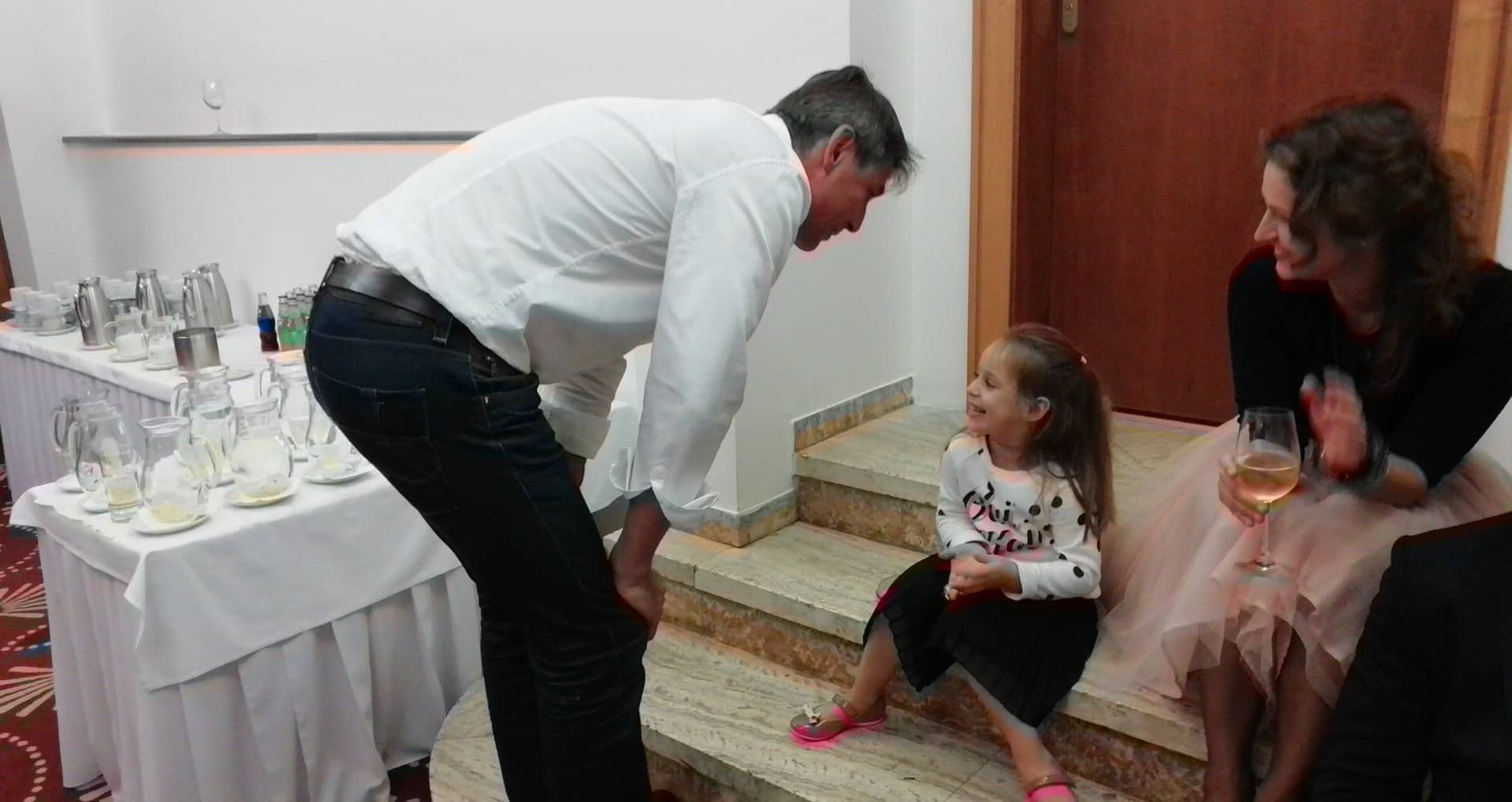 00:12 Ivo Nesrovnal s dcérou Adelkou vo volebnej centrále. Deti si poobede riadne pospali, tak vydržali dlhšie hore. V prípade potreby môžu ísť spať v priestoroch hotela.