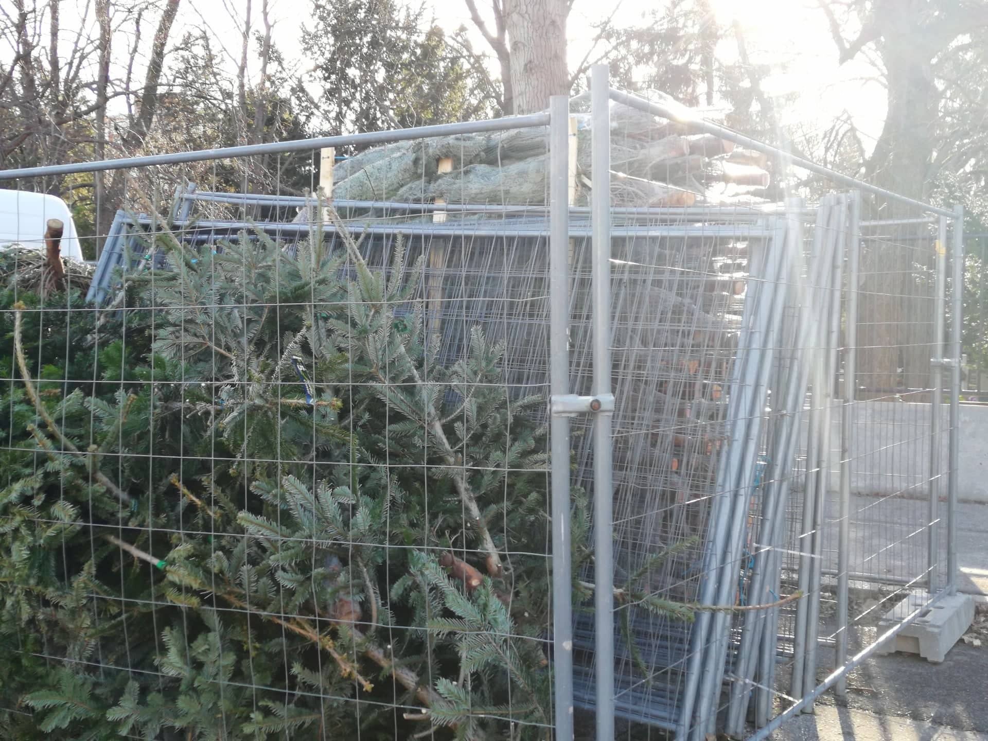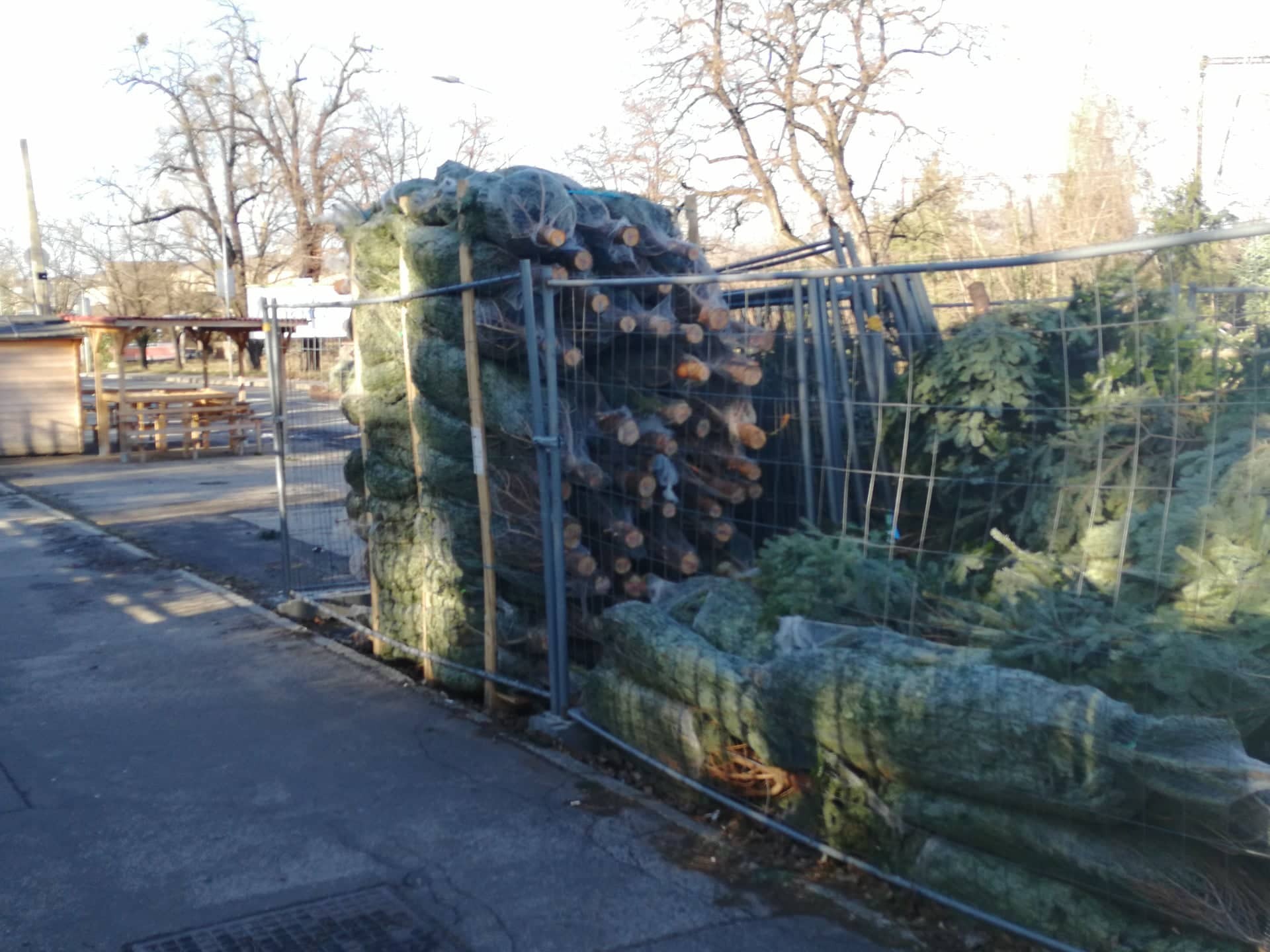 Asi zatiaľ najlepšie uskladnené nepredané vianočné stromčeky sme našli práve tu. Stromčeky boli na sebe pekne poukladané a zviazané, aby vietor a prípadné zlé počasie nerozfúkal vetvy a podobný zostatkový materiál. Navyše všetko bolo v železnej klietke, takže nič neobmedzovalo ani chodcov a navyše takto uskladnené stromčeky neprekážali ani na pohľad.