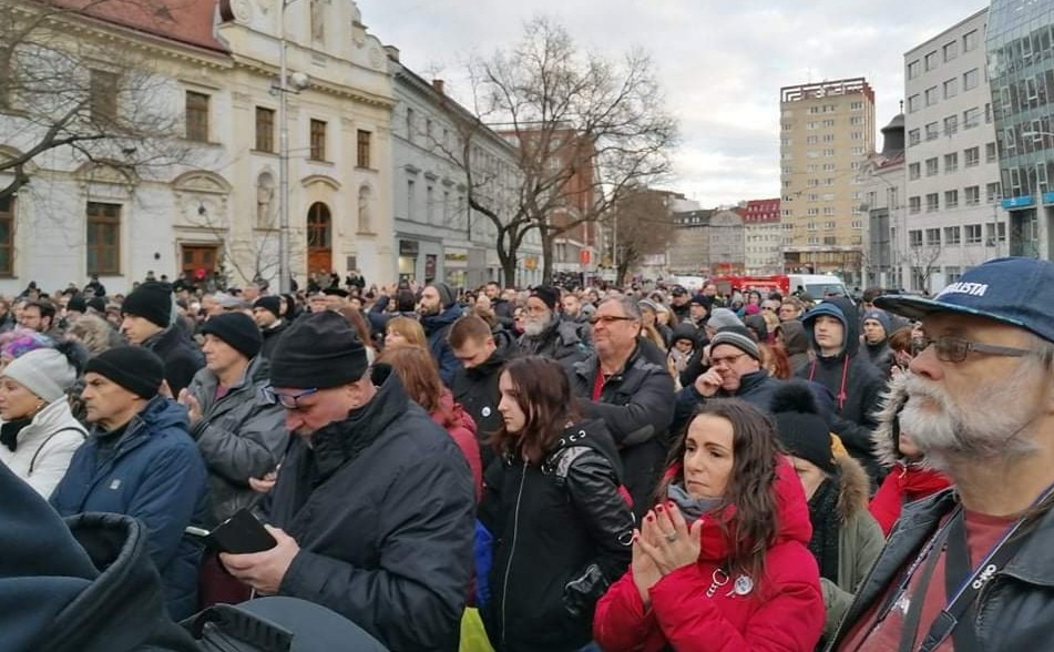 Na Námestí slobody sa zas o piatej konalo spomienkové zhromaždenie Za Jána a Martinu, za slušnú krajinu. Na pódiu si zavraždeného novinára a jeho snúbenicu pripomenuli pozostalí mladej dvojice, zástupcovia iniciatívy Za slušné Slovensko, novinári aj predstavitelia cirkví a kultúrneho života.