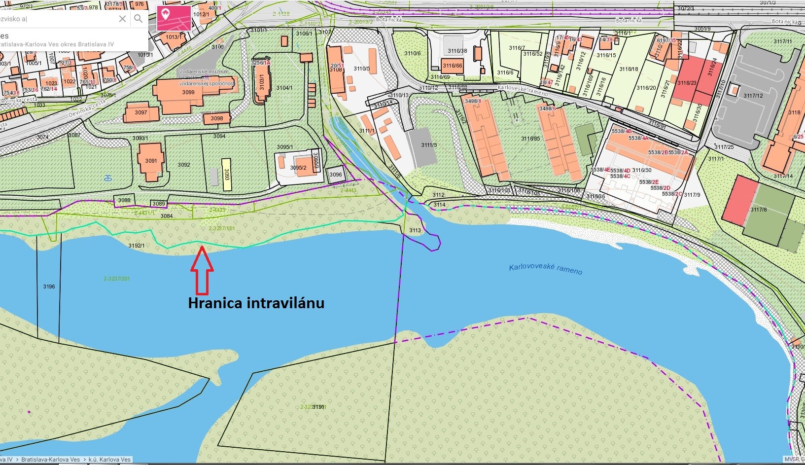 Zelená čiara zobrazuje hranice intravilánu pri Karloveskom ramene, park pri Vodárenskom múzeu je už v intraviláne mestskej časti.