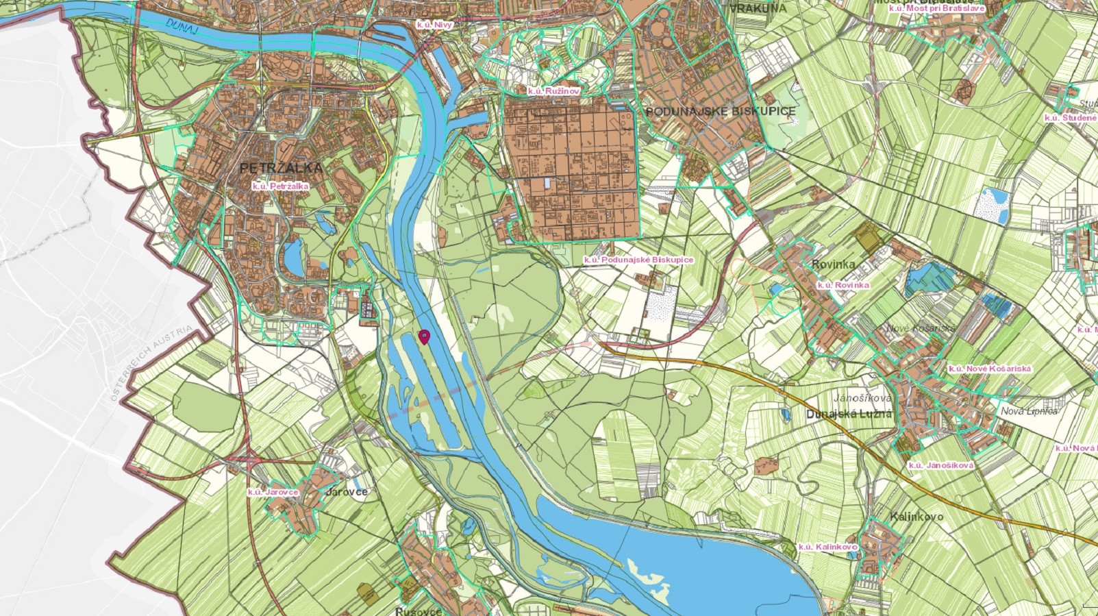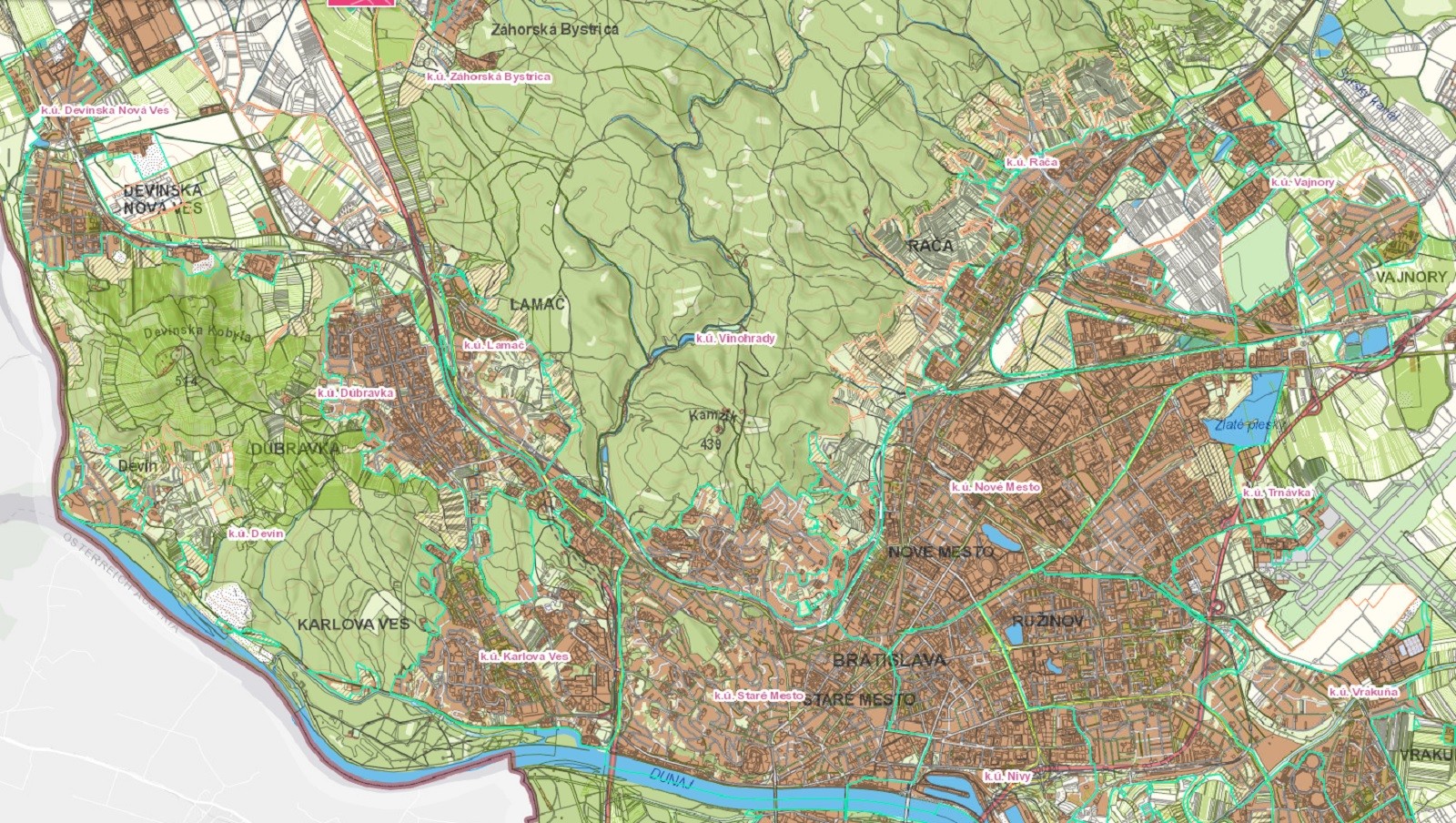Pohľad na Bratislavu (pravý breh Dunaja), hranice intravilánu sú vyznačené zelenu čiarou.