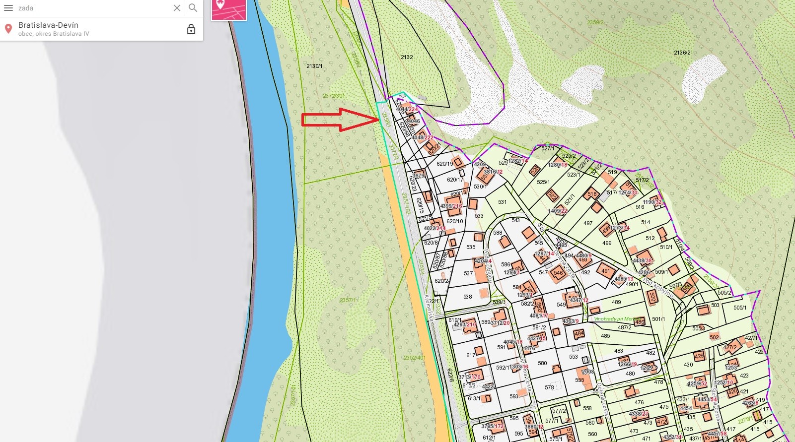 Pohľad na západnú časť Devína, zelená čiara je hranicou intravilánu, ako vidno, vozovka Kremeľskej ulice v obci je v intraviláne, cyklotrasa (svetlohnedá) už v extraviláne.