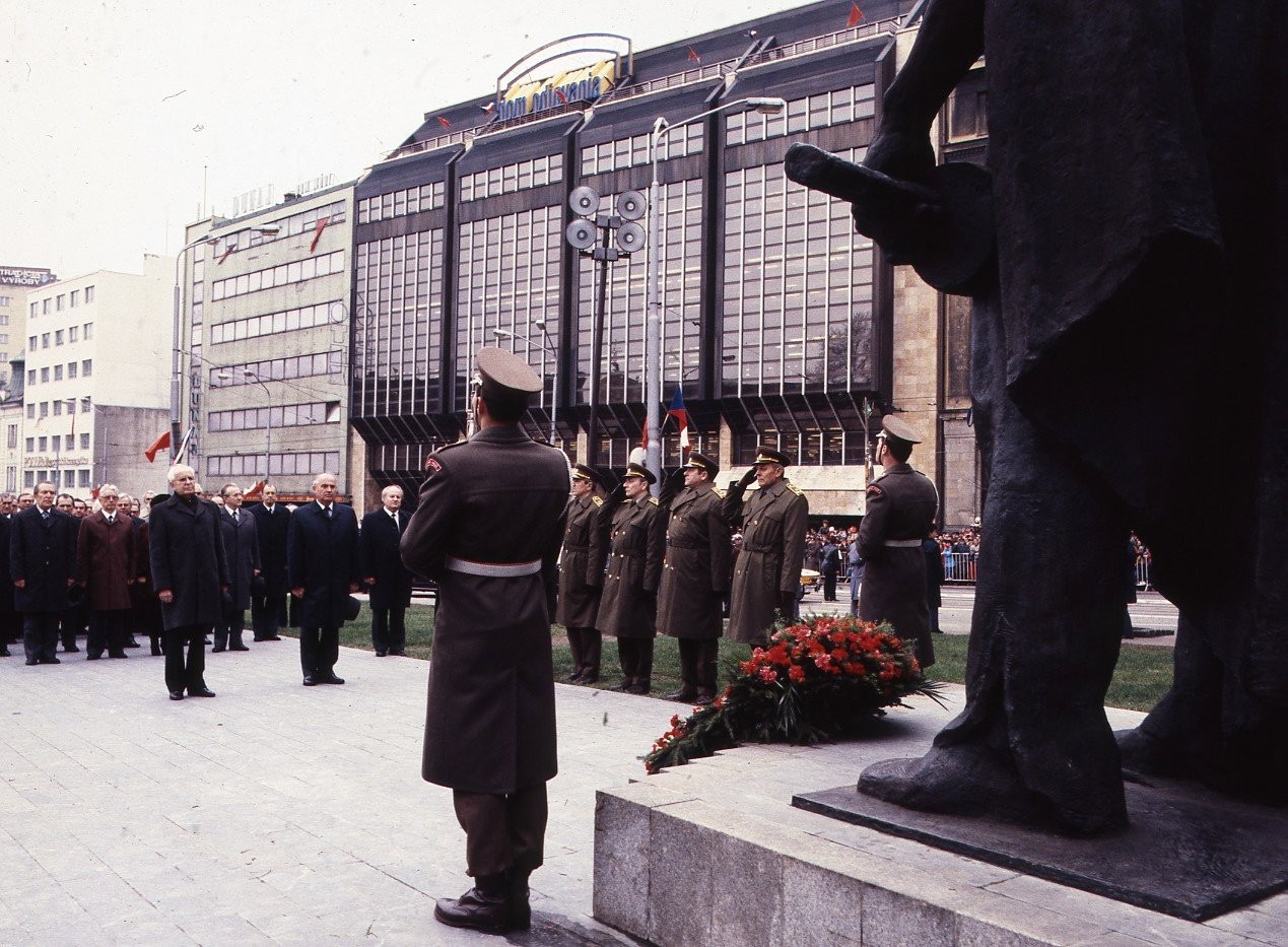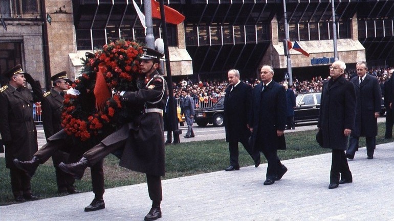 Gorbačov sa spolu s Gustávom Husákom v hlavnom meste Slovenska poklonili pamiatke účastníkov SNP a položili vence k ich pamätníku.