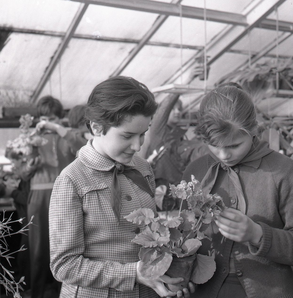 5. marec 1963: Pionierky kvetinárskeho krúžku v Dome pionierov a mládeže Klementa Gottwalda Gabriela De Lucca a Dagmar Pišoftová majú radosť z vypestovaných kvetov, ktoré pripravili k MDŽ.