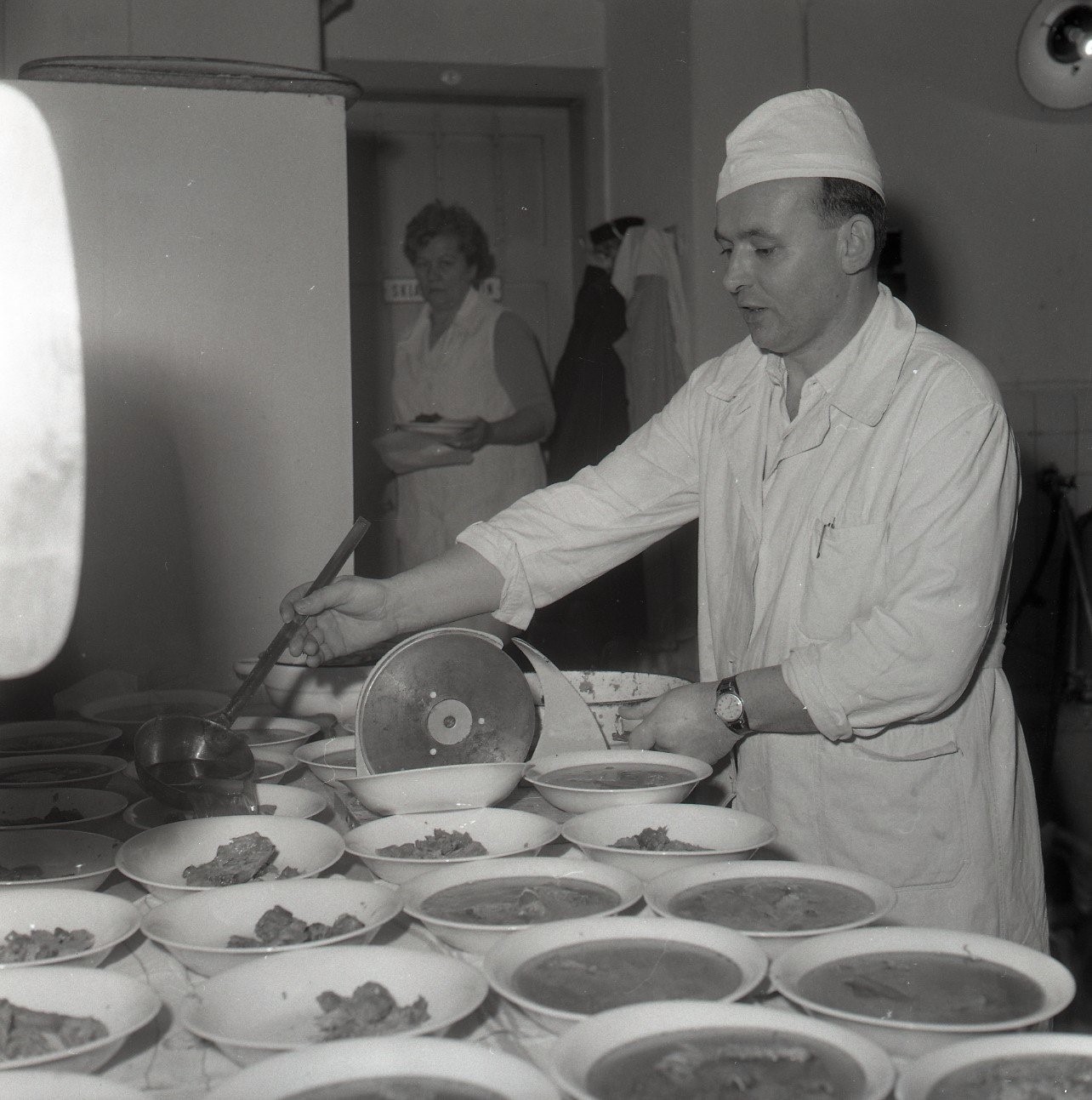 8. marec 1968, Ústav pre telesne postihnutých: Kuchárky mali voľno, porcie obeda rozdeľuje laborant Štefan Ištvaník.