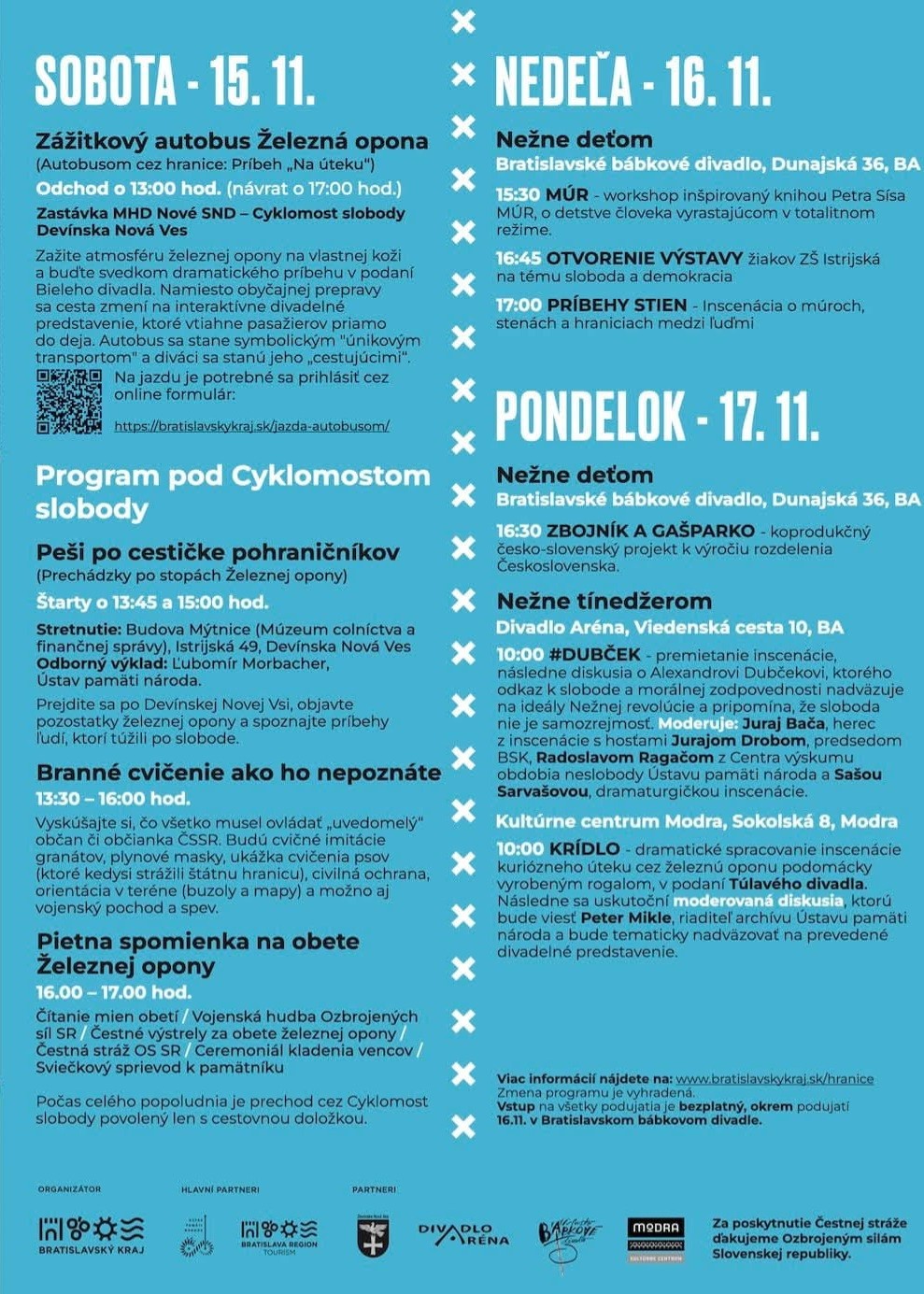 Víkend zatvorených hraníc pod Cyklomostom slobody v sobotu 15.11.2025Bratislavský samosprávny kraj (BSK) si opäť pripomína výročie Nežnej revolúcie podujatím Víkend zatvorených hraníc (15. - 17. 11.). Návštevníci zažijú atmosféru železnej opony na vlastnej koži, od divadelného predstavenia v autobuse cez branné cvičenie po pietnu spomienku obetiam totalitného režimu. Pripravená je séria kultúrnych a vzdelávacích aktivít.