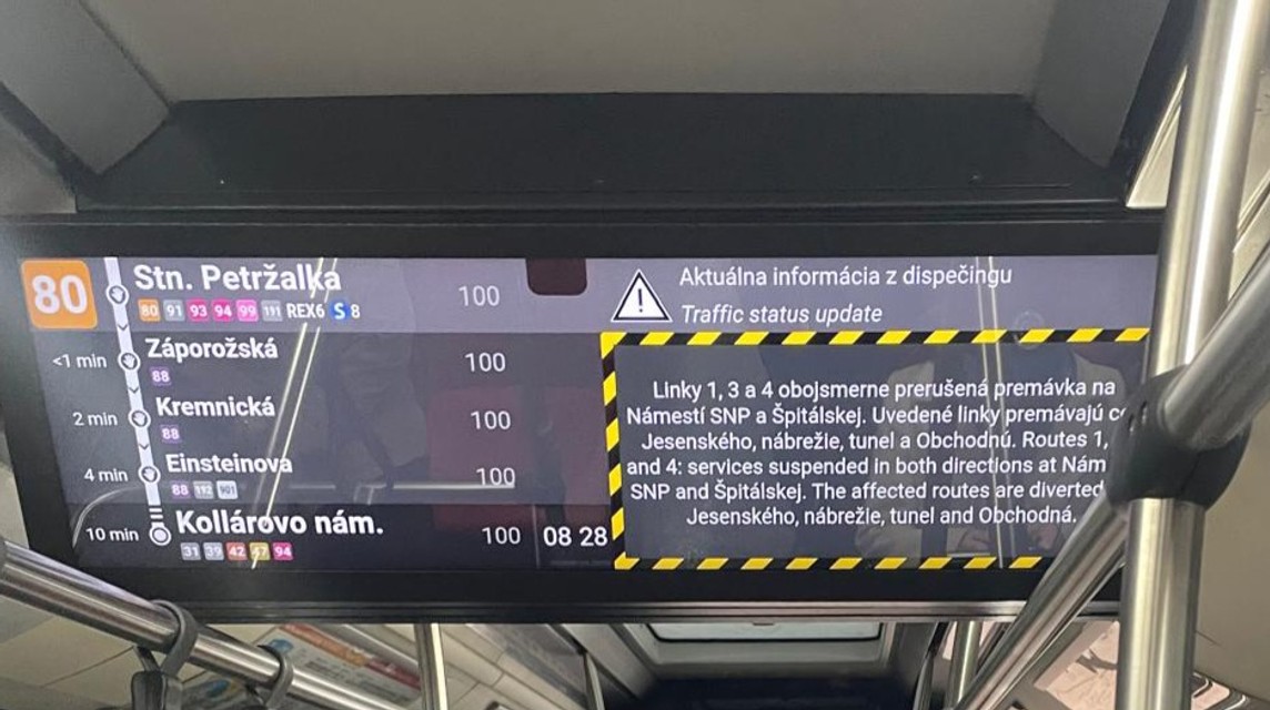 Veľké problémy hlási aj Dopravný podnik Bratislava. "Dnešné počasie dáva doprave v Bratislave riadne zabrať. Mrznúci dážď spôsobuje výrazné problémy pre osobnú dopravu, aj pre električky. Linky MHD v týchto chvíľach premávajú nepravidelne a pri cestovaní je potrebné rátať s meškaním. Naši dispečeri v teréne aj na operačnom pracovisku pracujú na usmernení liniek MHD a odstránení neprejazdných úsekov. Linky 1, 3 a 4 v tejto chvíli nepremávajú na Námestí SNP a na Špitálskej. Tieto linky sú odklonené cez Jesenského, nábrežie, tunel a Obchodnú. Všetky spoje linky 4 zároveň premávajú na konečnú zastávku Zlaté Piesky, medzi zastávkami Stn. Nové Mesto a Kuchajda premávajú kyvadlové autobusy," uviedol DPB na sociálnej sieti.