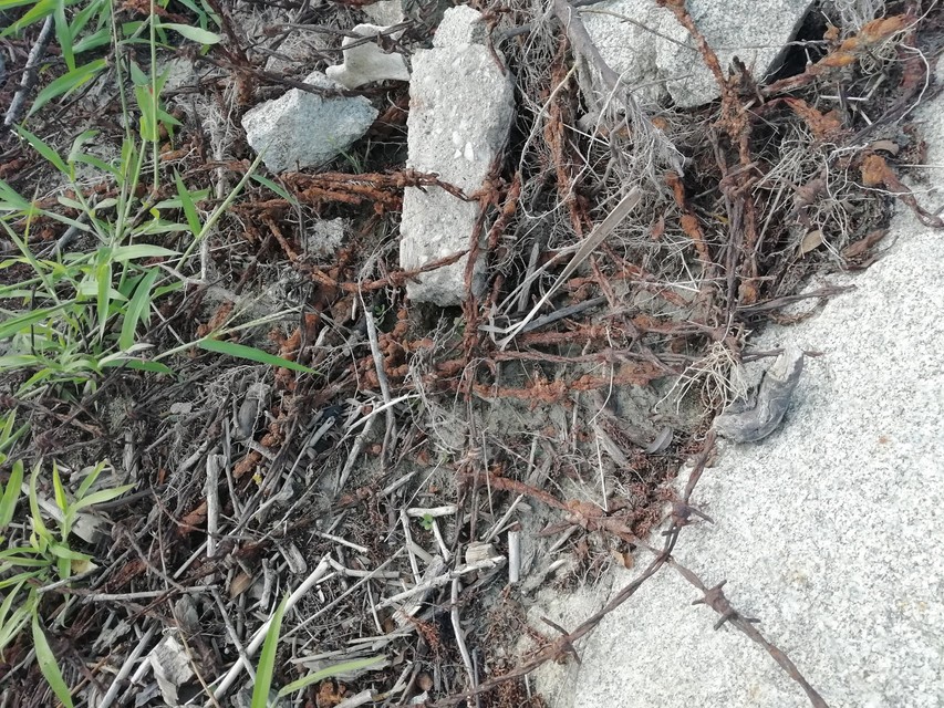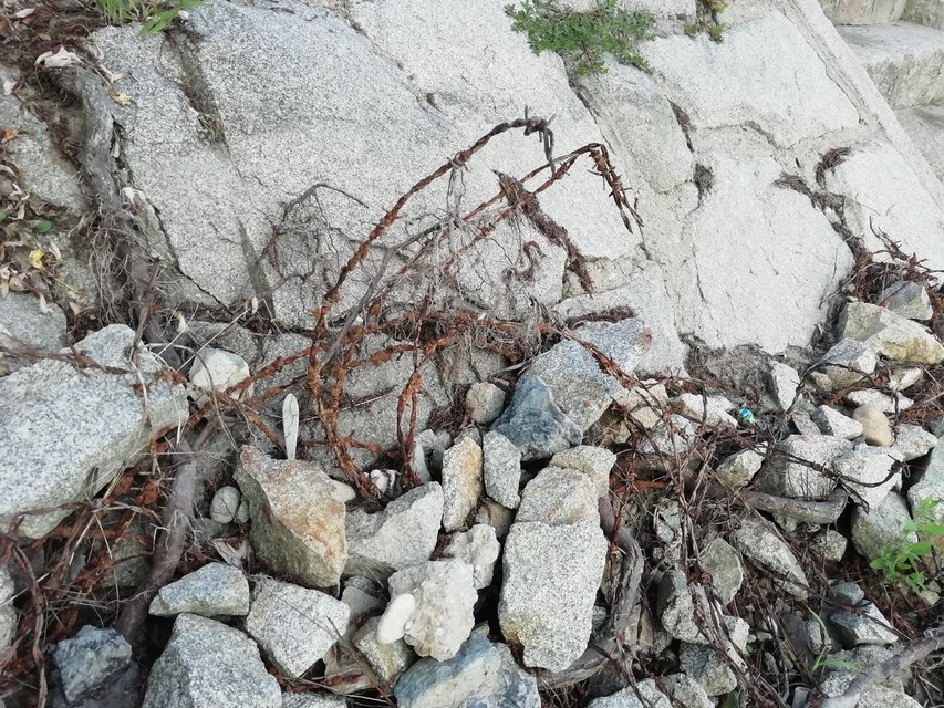 Spomínaný ostnatý drôt pod schodami sme našli i my. Je možné, že naozaj pochádza ešte z oplotenia tvoriaceho železnú oponu.