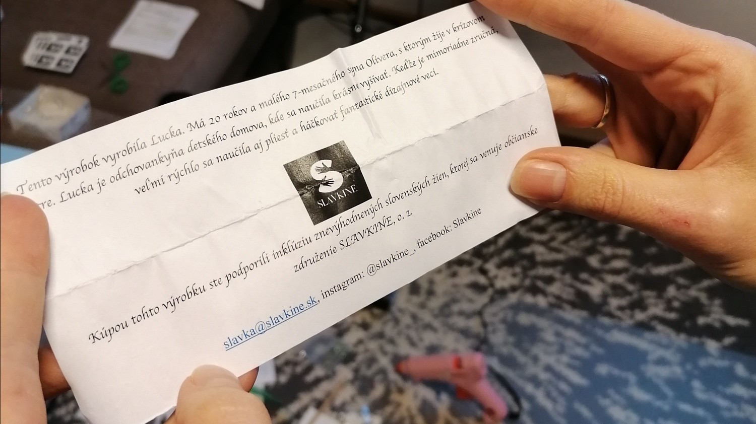Slávka žije v bratislavskom Devíne, no jej projekt už dávno presiahol hranice Bratislavy a nadobudol celoslovenské rozmery. Napohľad ide o geniálne jednoduchý nápad, no je za ním určite mnoho driny a problémov, ktoré bolo treba vyriešiť. Slávka založila občianske združenie Slavkine, ktoré dáva šikovným ženám žijúcim v ťažkých podmienkach možnosť privyrobiť si háčkovaním alebo pletením. Sveter, čiapka, kabát či rôzne doplnky a ozdoby, ktoré vyrobia z dodaného materiálu a podľa presných pokynov, sa následne predávajú v eshope. V projekte sú zapojené obyvateľky krízových centier, osamotené seniorky, zdravotne postihnuté ženy či Rómky z osád. A zákazník, ktorý si kúpi napríklad čiapku, nielen pomôže druhým, ale sa zároveň oboznámi s krátkym príbehom ženy, ktorá ju uháčkovala.