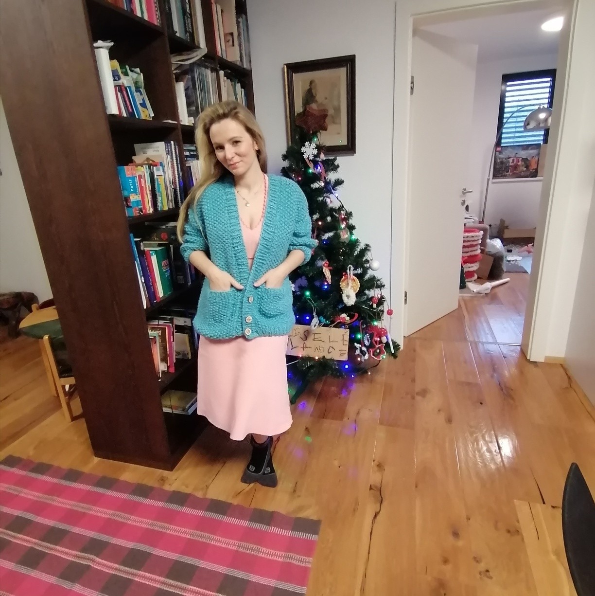 Slávka vo svetri vyrobenom v OZ Slavkine.