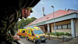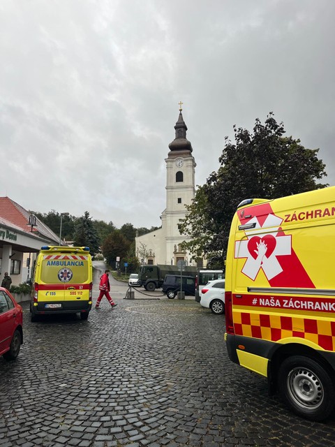 Obyvateľov odvážajú od domu kultúry na Devínsku Novú Ves vojaci.