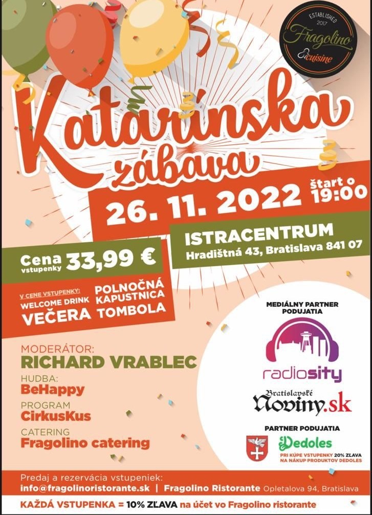 Do Devínskej Novej Vsi sa vracia tradičná a obľúbená Katarínska zábava. Množstvo zábavy a výbornej nálady si ľudia užijú v Istra centre na Hradištnej ulici.