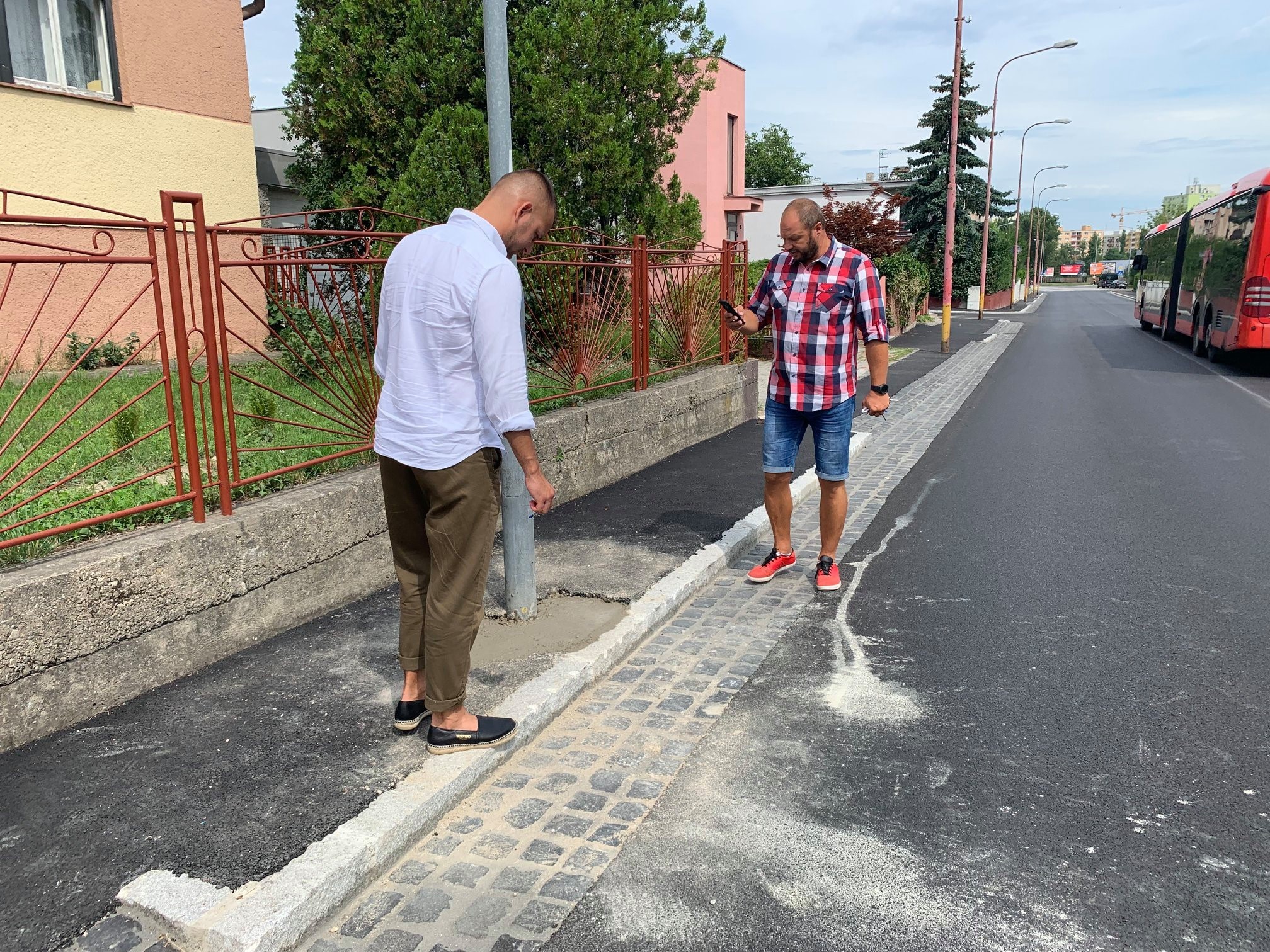 "Chlapci" z Miestneho úradu na čele so starostom MČ Dúbravka Martinom Zaťovičom (vpravo) na miesto hneď nabehli, aby si zdokumentovali aktuálny stav okolo stĺpu po oprave poruchy verejného osvetlenia. Náklady s uvedením chodníka do stavu po nedávnej rekonštrukcii by mal znášať bratislavský magistrát, ktorý sa stará o všetky komunikácie a chodníky, kde premáva MHD, čo sa týka aj Štepnej ulice.