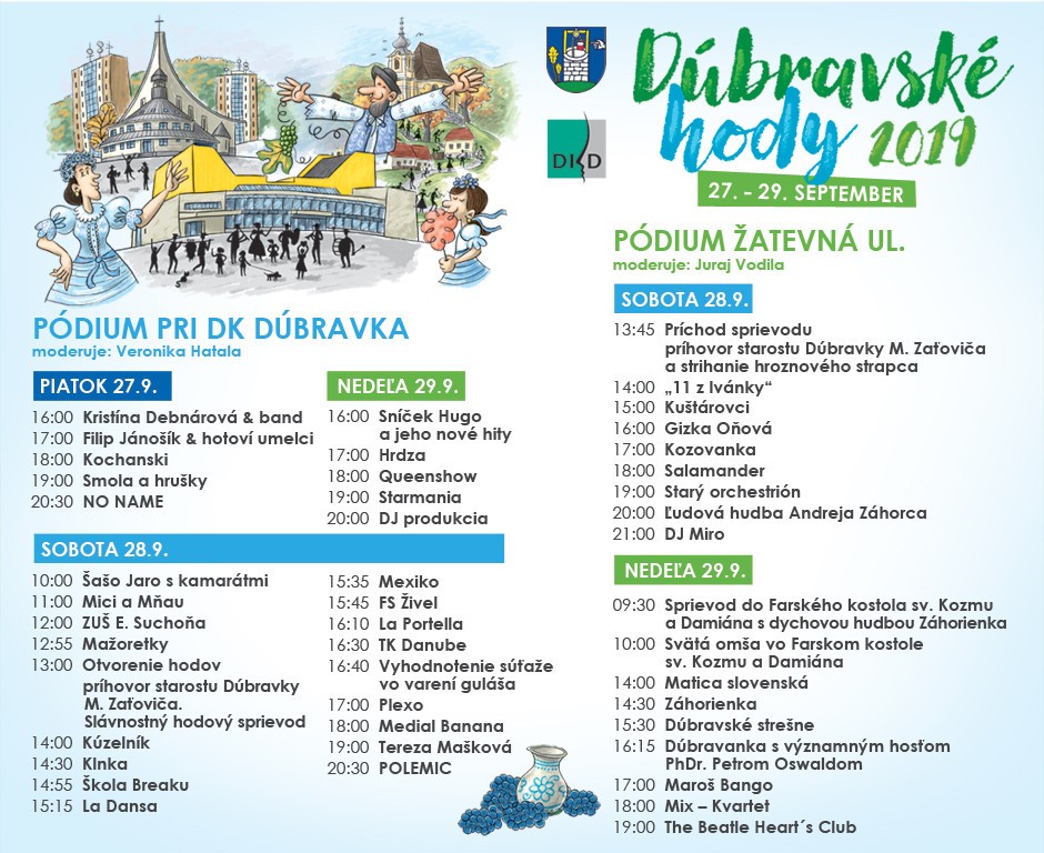 Koncerty pre mladých, divadielka a zábava pre najmenších, hudba a tanec pre seniorov, šport, remeslá, súťaže. Program prebieha na dvoch pódiách - väčšie pri Dome kultúry Dúbravka a komornejšia scéna bude v starej časti Dúbravky na Žatevnej ulici pri požiarnej zbrojnici. Obľúbenou už niekoľkoročnou novinkou je sobotný Remeselný dvor v Dúbravskom múzeu na ulici Pod záhradami s ukážkami a učením tradičných remesiel.