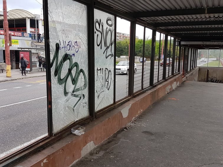 Ako po vybombardovaní. Vybité sklenené tabule, hrdzavá konštrukcia, špina a cestujúci, ktorí cez rozbité tabule nerozvážne vstupujú do cesty autám! To je realita električkovej zastávky Damborského na začiatku Dúbravky pri Dome služieb. Rovnako odpudzujúco vyzerá aj podchod od obchodnému domu k nástupištiam električiek.