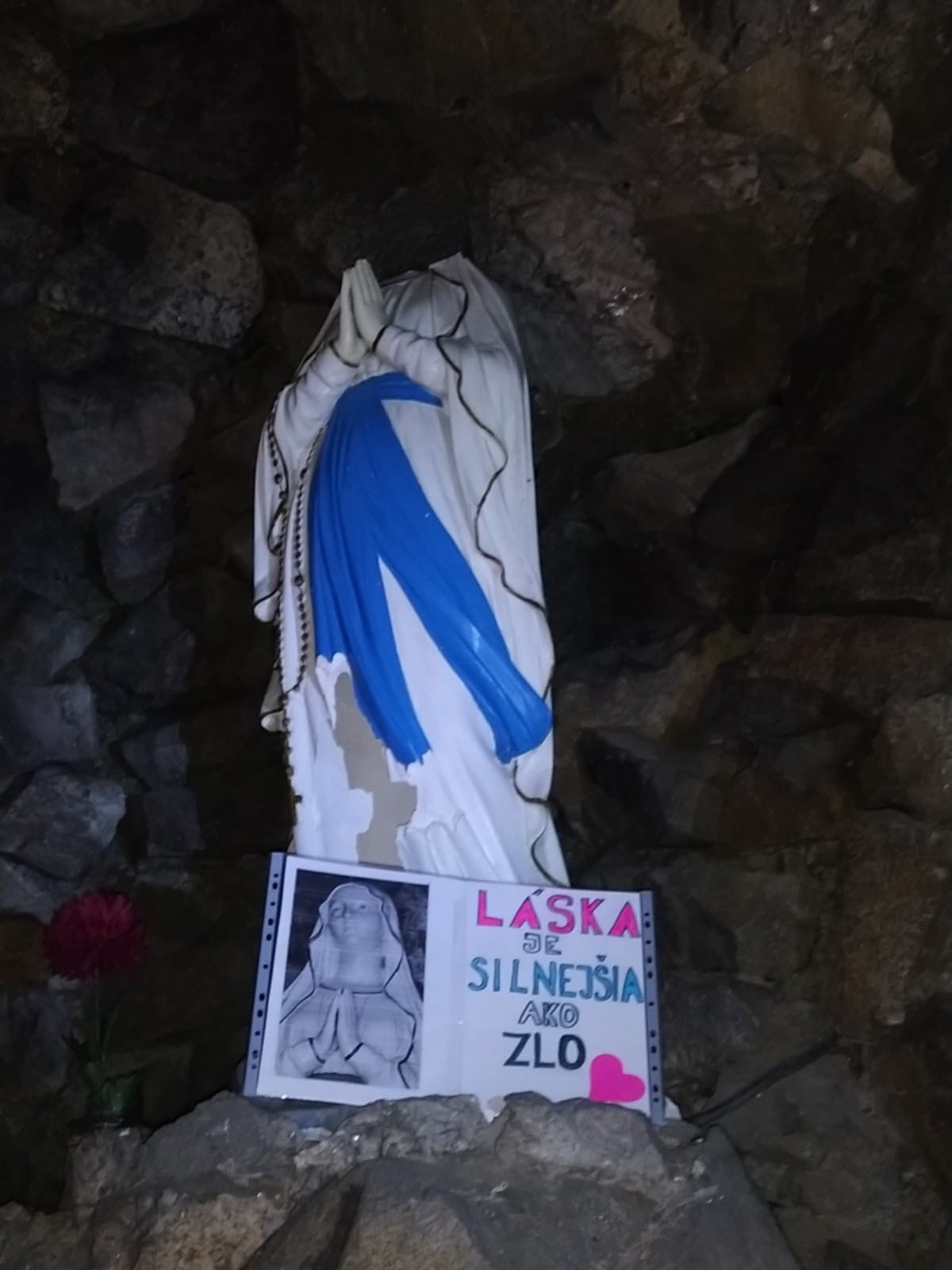 Je to smutný vianočný príbeh. Počas uplynulého víkendu vandali poškodili sochu Panny Márie na Brižitskej ulici v Dúbravke. Socha je dominantou kópie Jaskyne zjavenia z francúzskych Lúrd, jaskyňa je vybudovaná z lomového kameňa do svahu na Brižitskej ulici a bola doslova pútnickým miestom, kde sa veriaci zvykli zastaviť a pomodliť. Nález sošky bez hlavy Dúbravčanov veľmi nahneval!