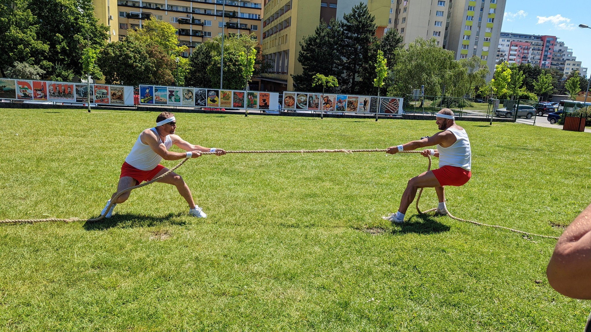 Preťahovanie lanom v podaní starostu Dúbravky Martina Zaťoviča (vpravo)