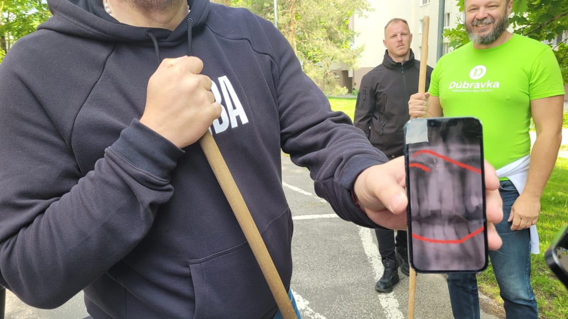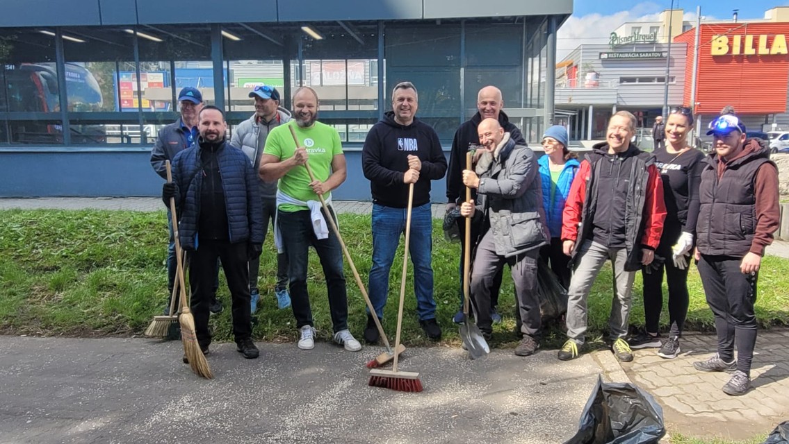 Danko s upratovacím tímom. V zelenom starosta Dúbravky Martin Zaťovič.