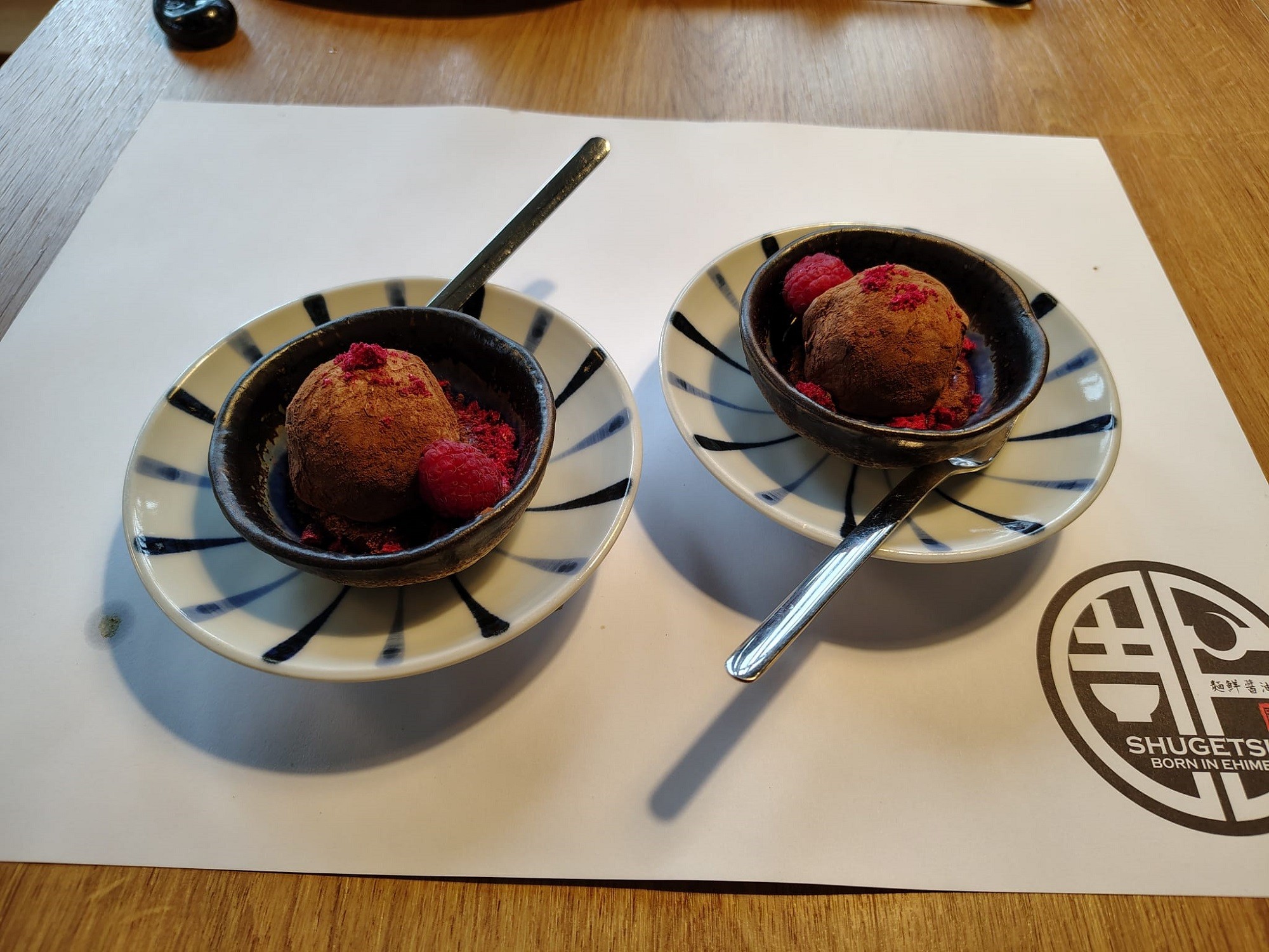 Na záver sme si dopriali ryžový koláčik Čokoládové daifuku (3,90 €), tradične plnený sladkou pastou z fazule. Bol to vynikajúci dezert s intenzívnou čokoládovou chuťou, ktorú osviežili sladko-kyselkavé maliny. Inak, daifuku v preklade znamená „veľké šťastie“, aj z toho nám v Shugetsu dopriali.