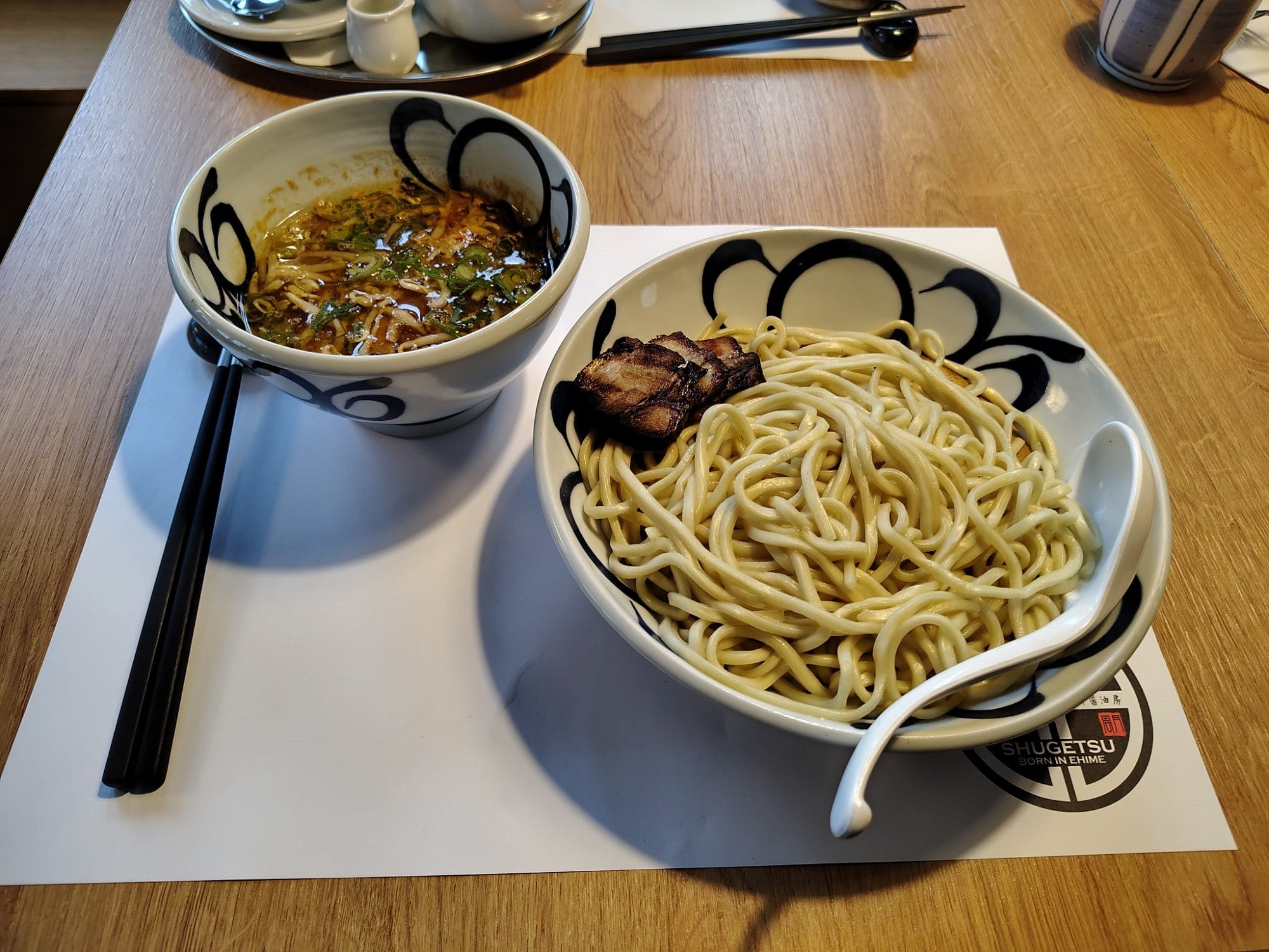 Pre Shio Ramen (11,90 €) sme sa rozhodli s nádejou, že rybacia chuť v ňom bude jemná, bola však o dosť výraznejšia, ako sme chceli. Rezance v nádhernej, ručne robenej keramickej miske (také sú všetky) boli úžasné, rovnako opečené plátky bravčového mäsa, chutné bolo takisto marinované vajíčko, ale ak vám príliš intenzívna rybacia chuť nesedí, dajte si poradiť inú verziu ramenu. Obsluhujúci personál je milý a pozorný, určite odporučí to najlepšie pre vás. V našom prípade sa práve Miso Tsukemen stal láskou na prvý hlt. Ale inak bola chuť Shio Ramenu príjemne delikátna a porcia veľká, najete sa dosýta.