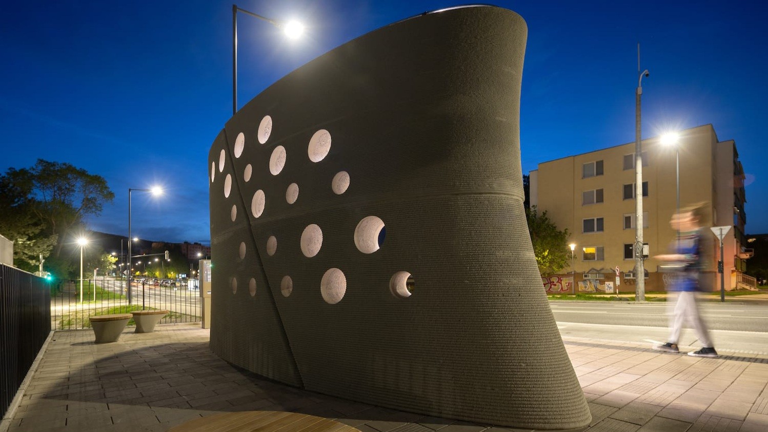 Jiří Vambera, Head of Development z ICE Industrial Services dodáva, že životnosť konštrukcie z 3D tlačeného betónu je porovnateľná s betónovými konštrukciami vytvorenými tradičnými metódami. Netreba sa preto obávať, že by moderná technológia šla na úkor kvality. Benefitom je aj menšie množstvo odpadu. „Pokiaľ by sme tvar tejto zastávky chceli realizovať konvenčnými metódami, museli by sme najskôr vyrobiť a postaviť jednorazovú formu, čo by bolo výrobne veľmi náročné a vygenerovalo by to zbytočný odpad. Vďaka 3D tlači celá táto fáza odpadla a tlačili sme priamo samotnú formu,“ dodáva Mačuda.