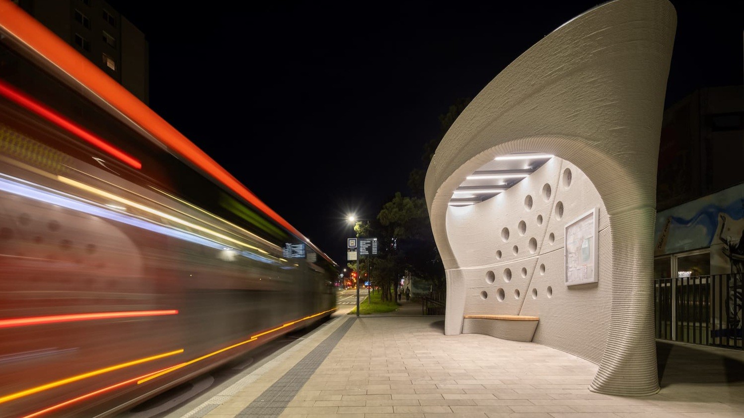 Výrazná betónová konštrukcia s ostro rezanými líniami vďaka otvorom v stene pracuje so svetlom počas dňa a vytvára tak zaujímavé svetelné efekty. Večer sa autobusová zastávka rozsvieti podsvietením, ktoré zvýrazňuje jej tvar a zároveň prispieva k bezpečnosti. Zastávka má byť navyše odolná, trvácna a nenáročná na údržbu.