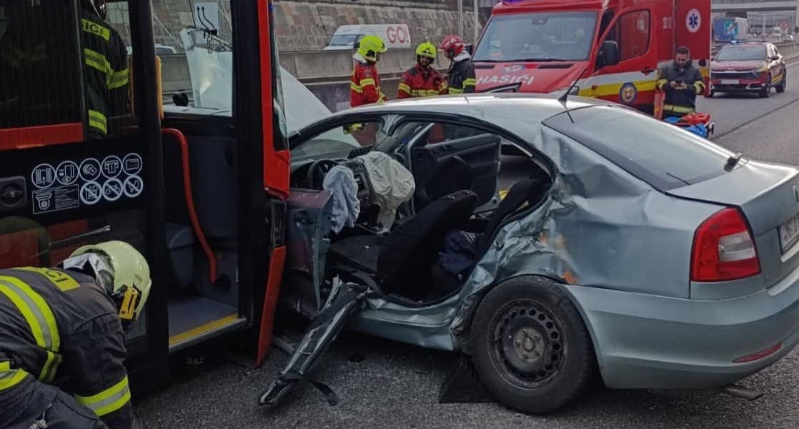Na diaľnici za Lamačom havaroval autobus so 70 ľuďmi, zrazil sa s osobným autom