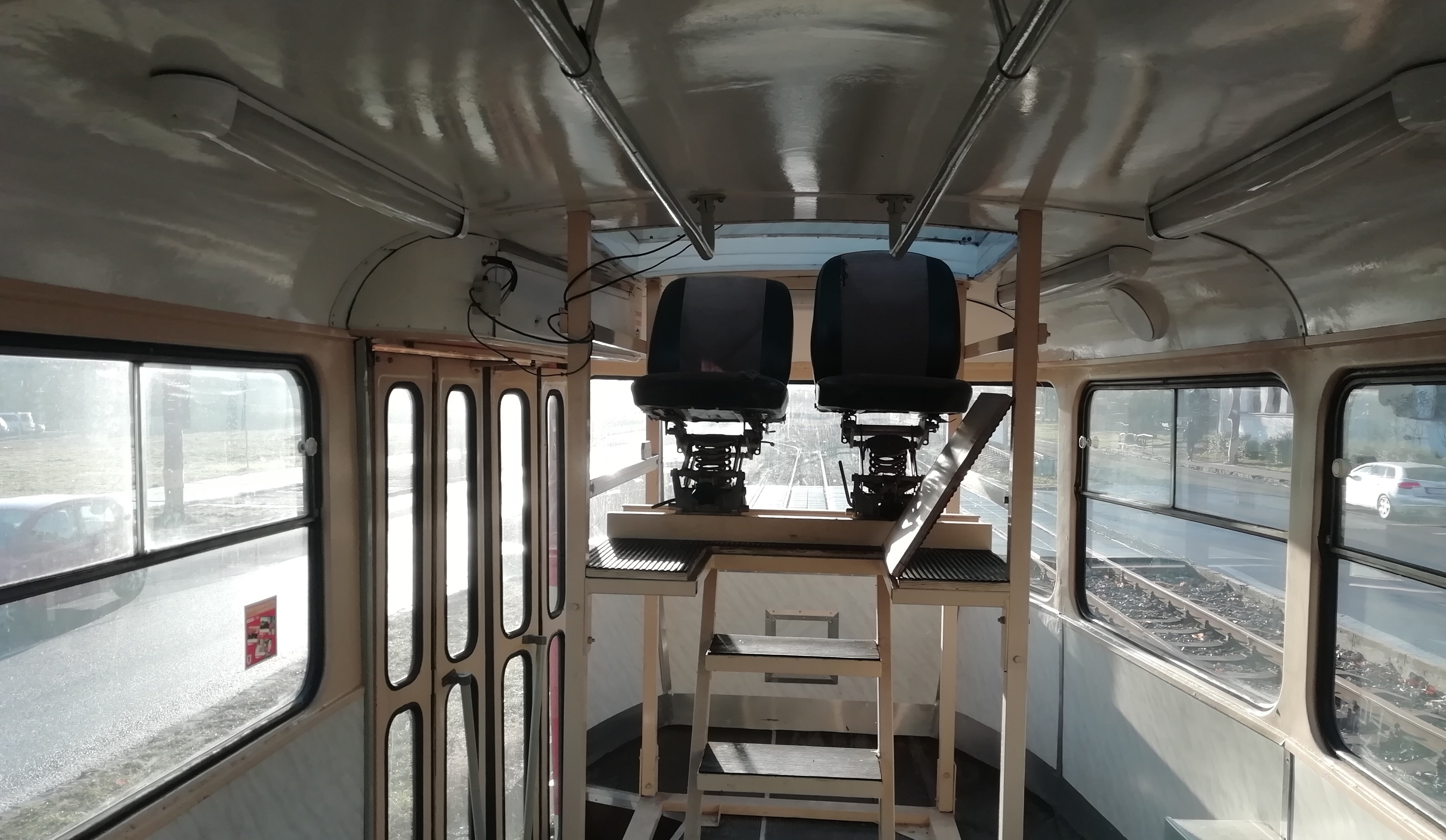 V zadnej časti vozdila sa nachádzajú dve sedadlá, z ktorých môžu pracovníci DPB sledovať ponad strechu trolejové vedenie i okolie. Je tu i kamera, ktorá všetko zaznamenáva a zábery prenáša do počítača. Ďalšie údaje smerujú do počítača priamo zo zberača na streche električky.