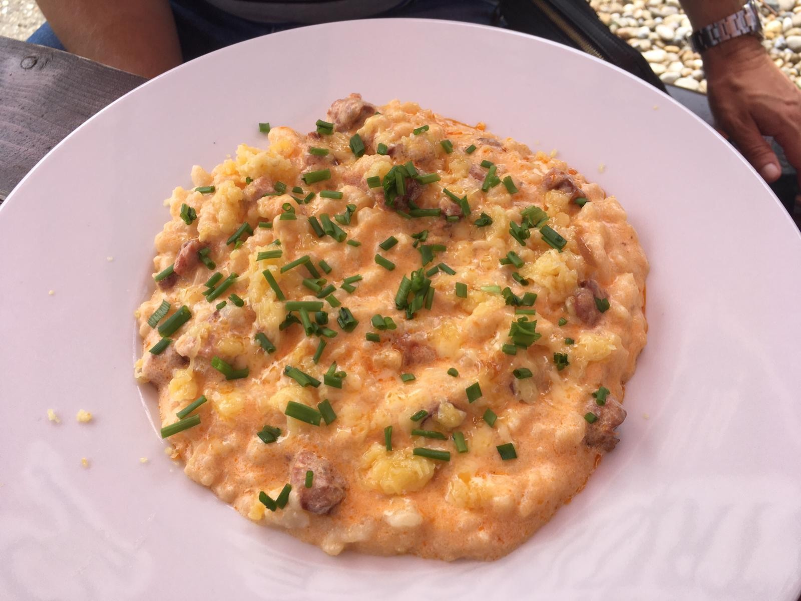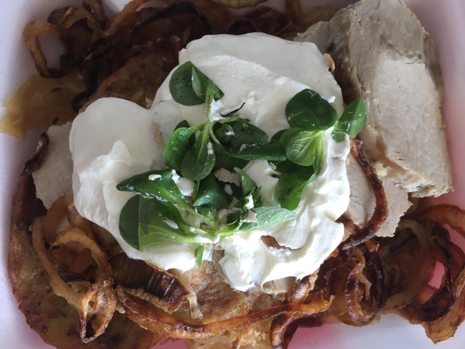 Najviac sme zaplatili za Zemiakové placky s grilovanou krkovičkou a karé prekladané dusenou kapustou a preliate prírodnou omáčkou (10,90 €). Obrovská porcia však bola úmerná vyššej cene, najedia sa aj dvaja. Mäso chutilo skôr ako pečené, nie grilované, škoda. Placky (mali sme ich tri) boli tenšie, ale veľmi dobre ochutené, neboli pripečené ani tvrdé. Kapusta bola kyslá akurát, ochutená len mierne, a práve preto bola veľmi fajn, nestratila sa totiž jej typická chuť. Navrchu spravila chuť opražená cibuľka.