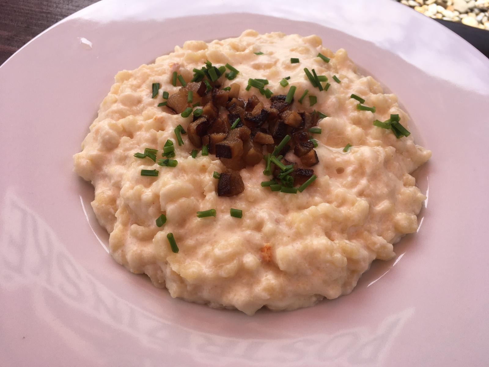 Veľká bola i porcia Furmanských halušiek s kyslou smotanou, oštiepkom a klobásou (6,90 €), nedokázali sme ju dojesť. Halušky boli síce chuťovo menej výrazné, žiadalo sa prisoliť ich, ale boli čerstvo pripravené, ako na poctivom salaši.