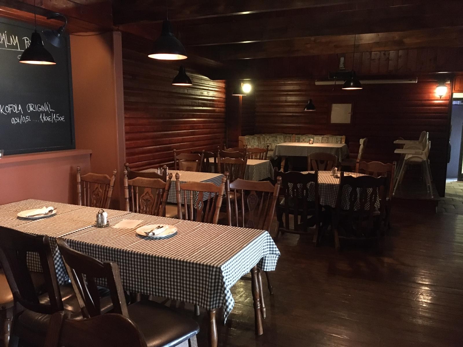 Do koliby sme zašli v pracovný deň na obed a hoci už po dvanástej prichádzalo dosť ľudí, podnik nebol preplnený. Zariadenie interiéru je štýlové, naozaj sa cítite tak trochu v inom svete. Ak sa však posadíte von na terasu, atmosféra hôr je ďaleko. Ale v poriadku, hlavné je, že kuchyňa nesklamala. Hoci čašník nás spočiatku zaskočil.