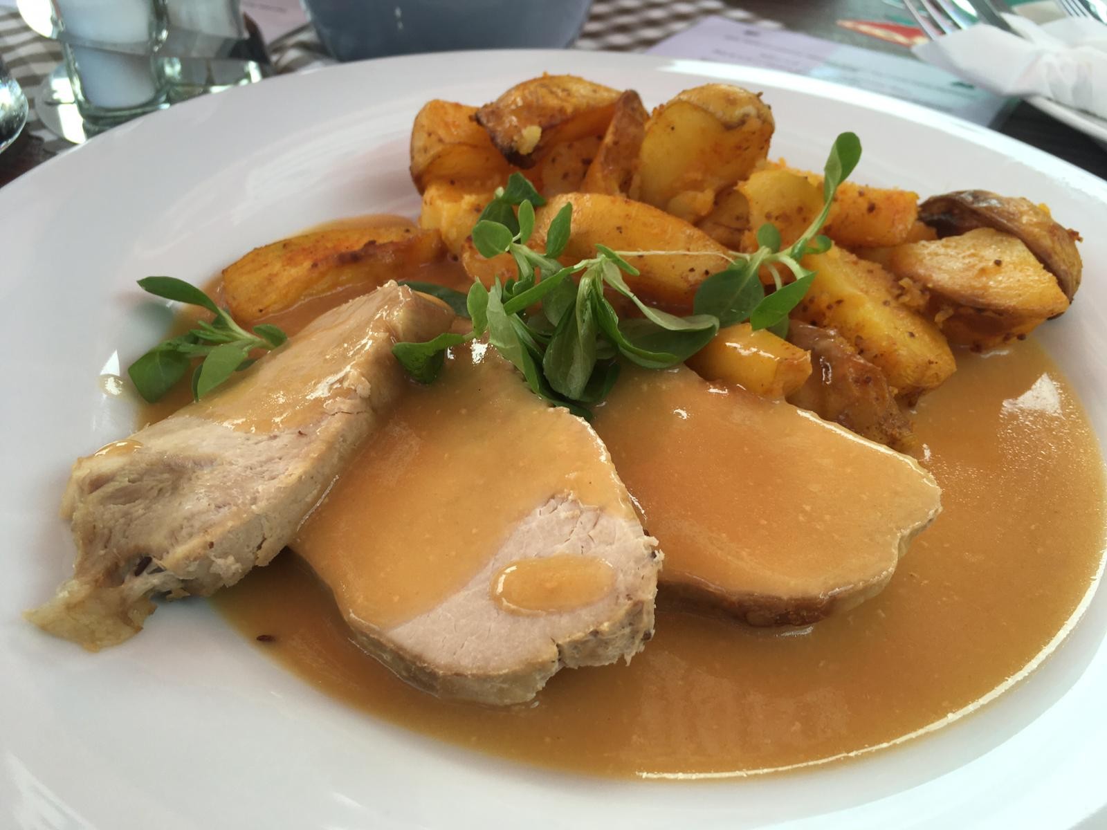 Prvé jedlo sme vyberali z ponuky denného menu, stavili sme na zemiakovú polievku s klobásou a pečené bravčové karé na medovo-horčicovej omáčke s americkými zemiakmi (4,90 €). Polievka bola bez chyby a suchšiemu karé zase dosť pomohla jemná omáčka. Pri nej sme trochu váhali pri identifikovaní chutí, ale inak fajn. Pečené zemiaky ako príloha k mäsu boli dobre ochutené.