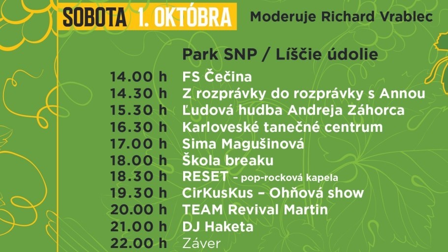 Sobotňajší program otvorí Folklórny súbor Čečina, po ktorom prevedie deti z rozprávky do rozprávky Anna. Po nej sa návštevníci vrátia k folklóru vystúpením Ľudovej hudby Andreja Záhorca. Ukážky štandardných a latinskooamerických tancov predvedú mladí tanečníci z Karloveského tanečného centra. Po nich vystúpi speváčka Sima Magušinová (Martausová). Nasledovať bude Škola breaku, vystúpenie pop-rockovej kapely RESET a ohňovú šou predvedie CirKus-Kus. Známymi hitmi zabaví publikum TEAM Revival Martin. Na záver zahrá DJ Haketa. Moderuje Richard Vrablec.