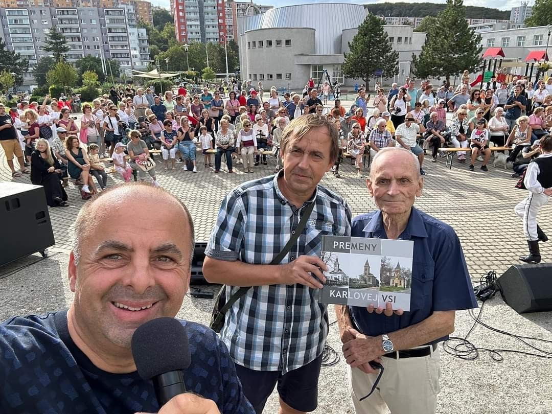 Moderátor Richard Vrablec, Daniel Kollár a Matúš Šrámek, jeden z autorov knihy Premeny Karlovej Vsi.