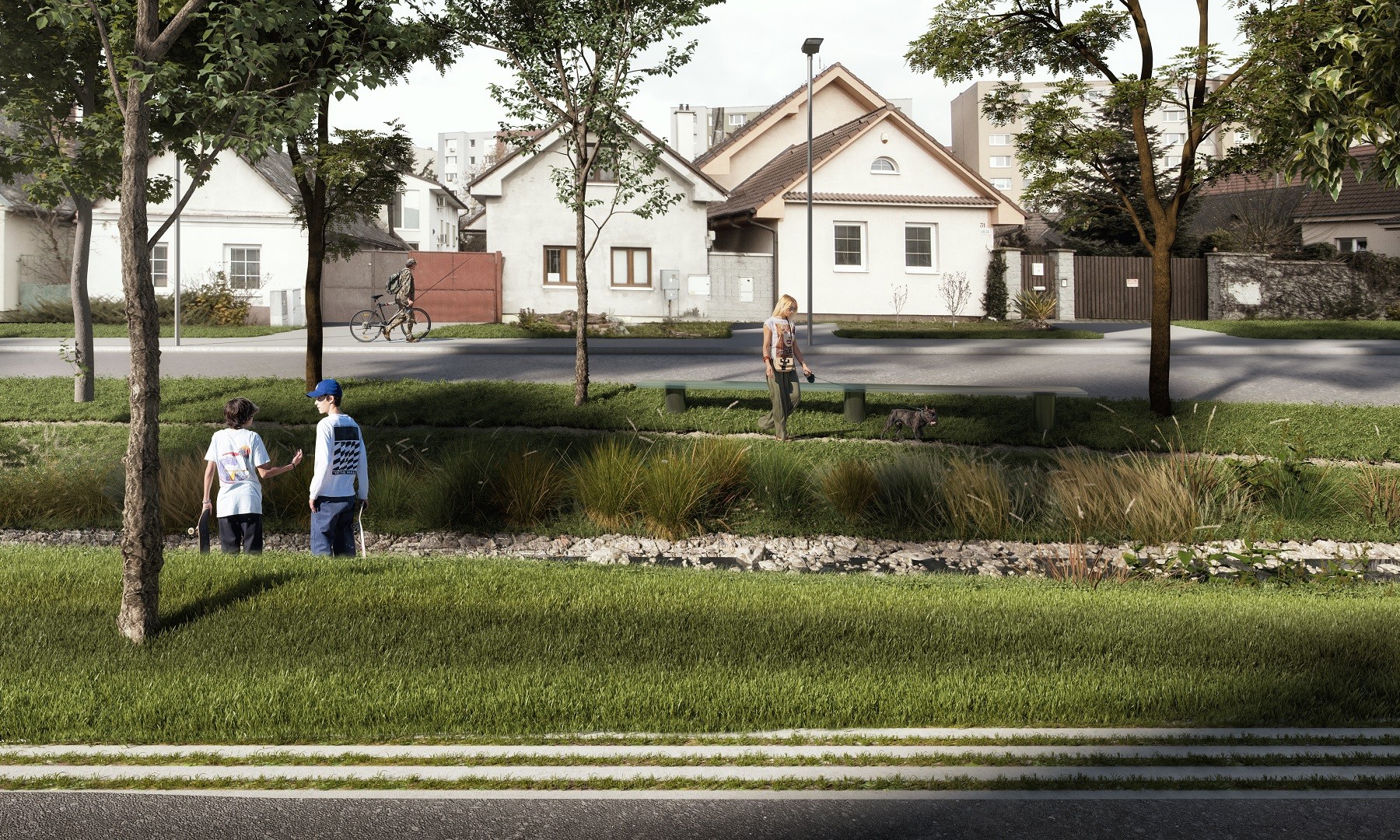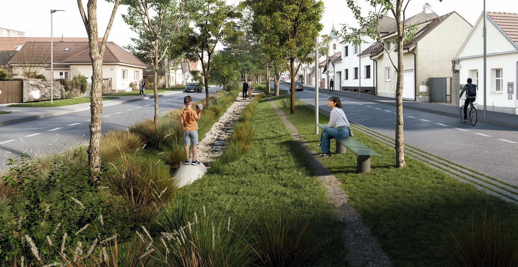 Vďaka novej koncepcii zelene sa stredový pás zmení na miesto, kde sa budú môcť miestni stretávať a oddychovať. Pribudnú lavičky aj stromy, ktoré zabezpečia prirodzený tieň. Po rokoch sa obnoví aj vodné koryto, ktoré spríjemní lokálnu mikroklímu, a tiež prispeje k lepšiemu zachytávaniu zrážkovej vody.