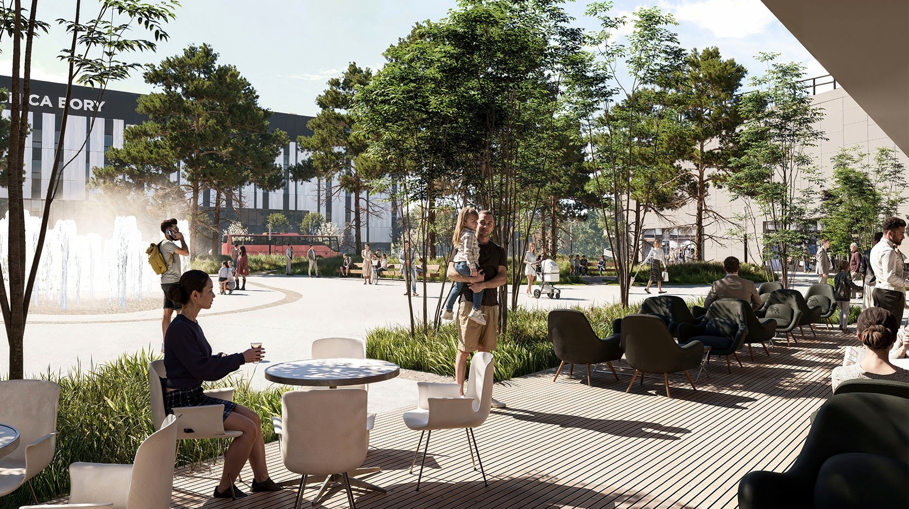 "Námestie pracuje s konceptom prelínania štyroch zón, z ktorých každá plní inú funkciu. Fasádu so vstupom do nákupno-zábavného centra oživia nové letné terasy gastro prevádzok, ktoré zároveň vytvoria prirodzené prepojenie so zvyšným areálom námestia. Centrálna časť námestia s fontánou poskytne ideálne miesto pre kultúrne vyžitie. Tento živý priestor bude vhodný pre umiestnenie trhových stánkov s predajom lokálnych produktov, remesiel a suvenírov, dočasných trhových stánkov a organizáciu podujatí s dostatočným priestorom na umiestnenie pódia. Stredovú časť námestia bude obklopovať zelený park s celkovou rozlohou zelene 2 800 m² a rozmanitou sadovou úpravou. Súčasťou budú tri pokojné miesta na oddych s lavičkami, prirodzeným tieňom stromov a umeleckým hracím prvkom.," informoval na svojej stránke developer Penta Real Estate.