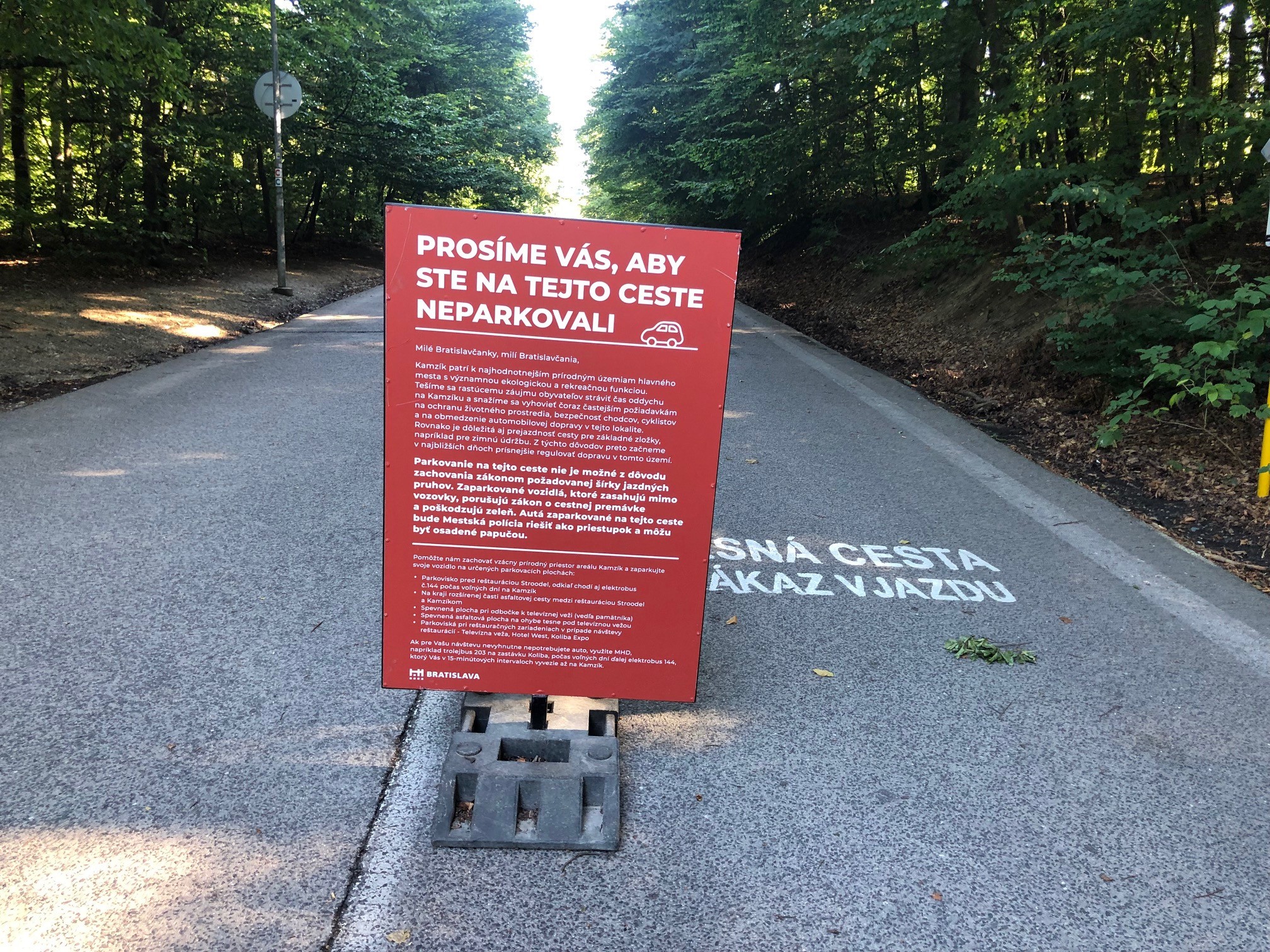 Dnes ráno o 7:00 hod sme si išli zabehať do príjemného prostredia na Železnú studničku. Po odbehnutí sme chceli využiť nové sprchy, ktoré včera uviedli Mestské lesy do prevádzky. Odparkovali sme na parkovisku, na ceste k lanovke vás upozorňuje už nová zvislá tabuľa, ktorá zakazuje motorovým vozidlám vstup a následné zaparkovanie na ceste.